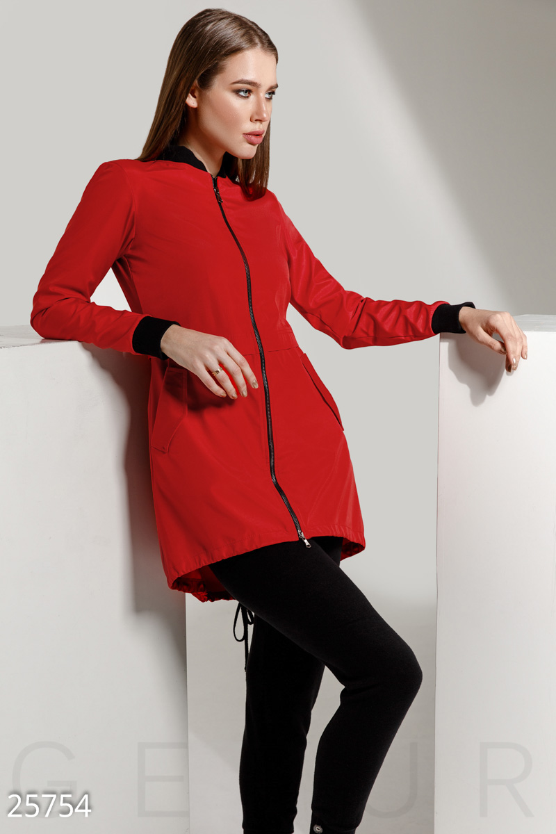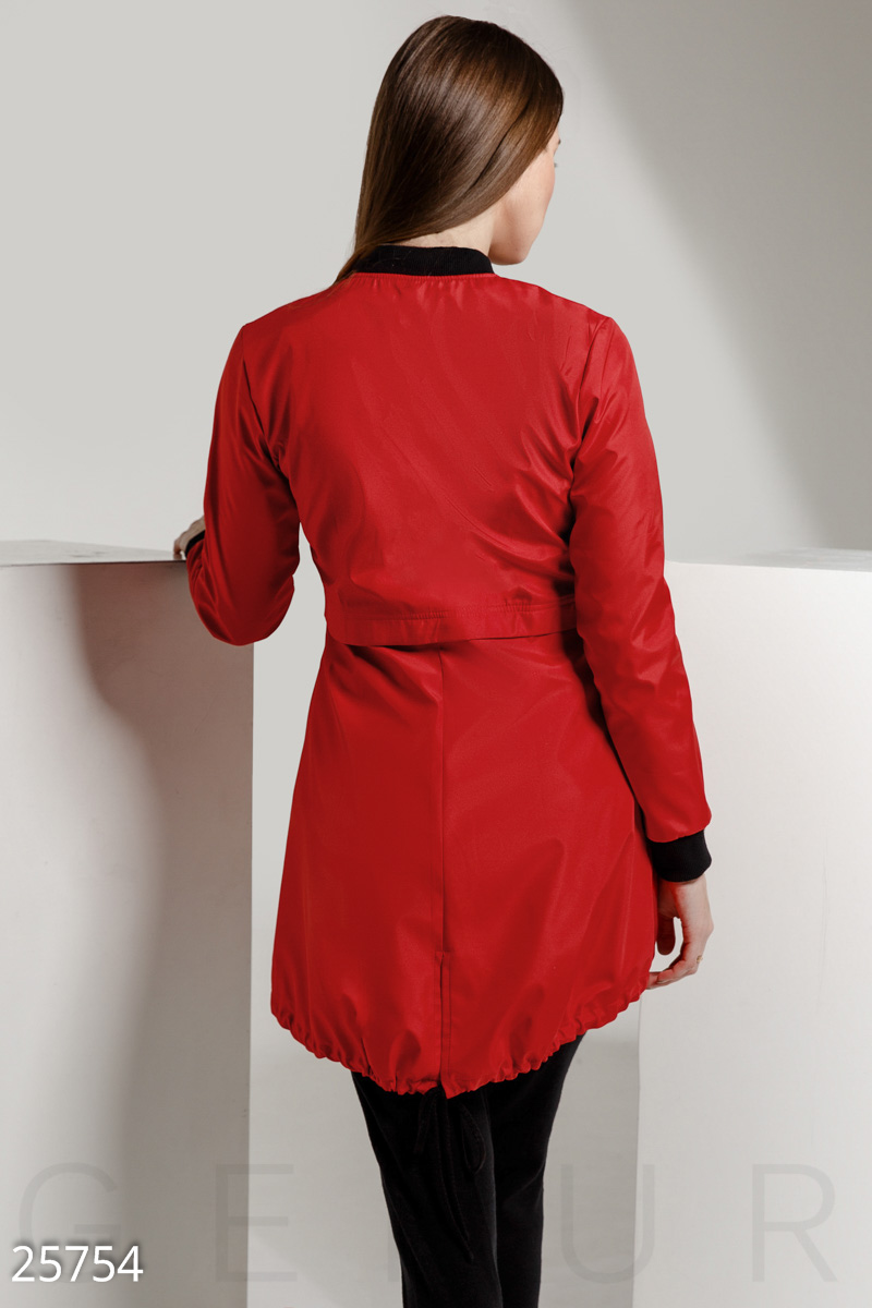 Демисезонная парка из плотной плащевой ткани, с двумя прорезными карманами с клапаном, небольшим разрезом сзади и удлиненным подолом с завязками на кулиске.