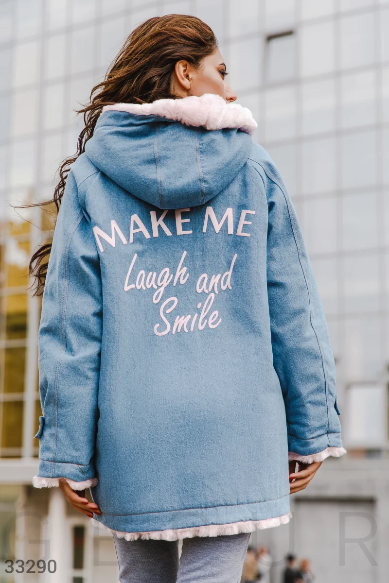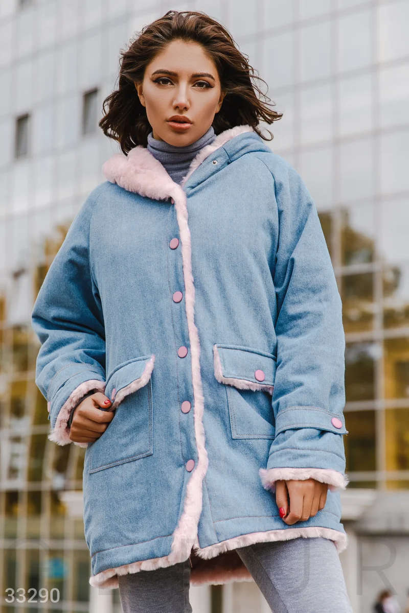 Трендовая денимовая парка с утеплителем из эко-меха нежно-розового оттенка: капюшон, длинный рукав с декоративной застежкой, планка с кнопками спереди и два накладных кармана с клапаном по бокам.