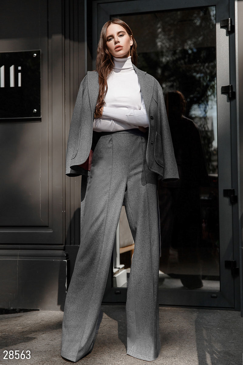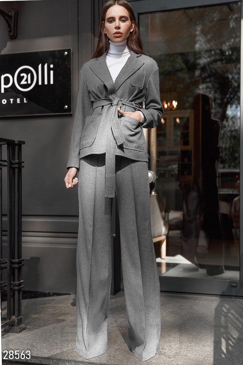 Элегантный шерстяной жакет от дизайнеров Gepur: аккуратный отложной воротник с лацканами, небольшой нагрудный и два накладных кармана по бокам, закругленный подол и съемный пояс в петлях.