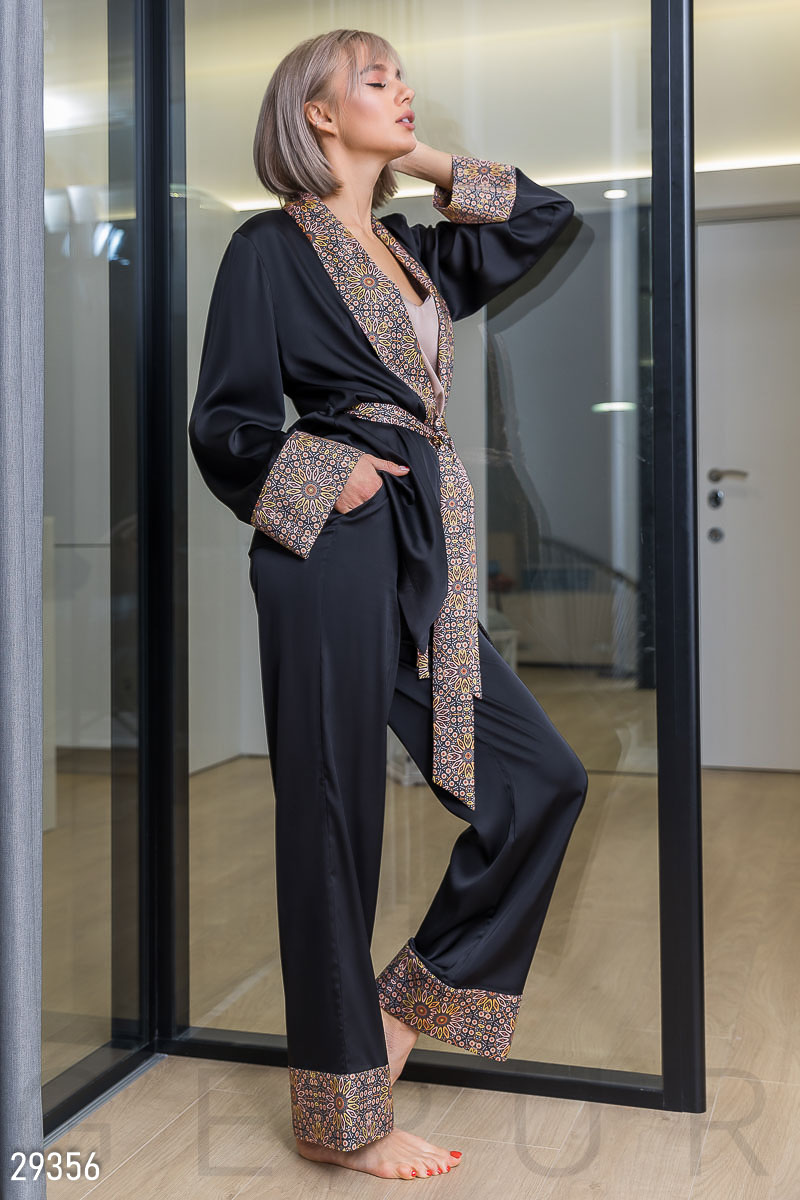 Пижама из шелка от дизайнеров Gepur: жакет с шалевым воротником, съемным поясом, свободным рукавом с широкой манжетой, брюки на завязках с двумя прорезными карманами.