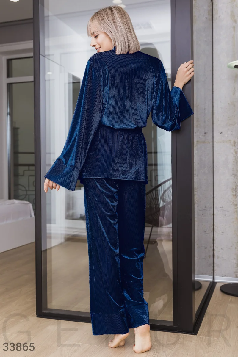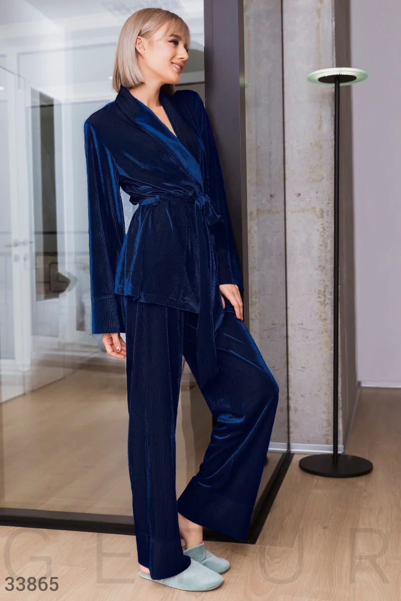 Теплая женская пижама от дизайнеров Gepur: жакет с аккуратным воротом, слегка расклешенным рукавом и поясом в тон, брюки с завязками, эластичным поясом и втачными карманами по бокам.