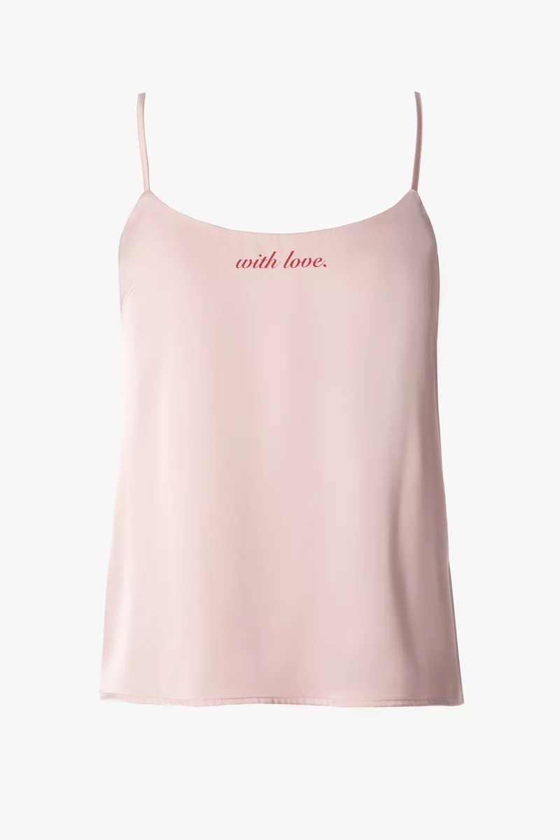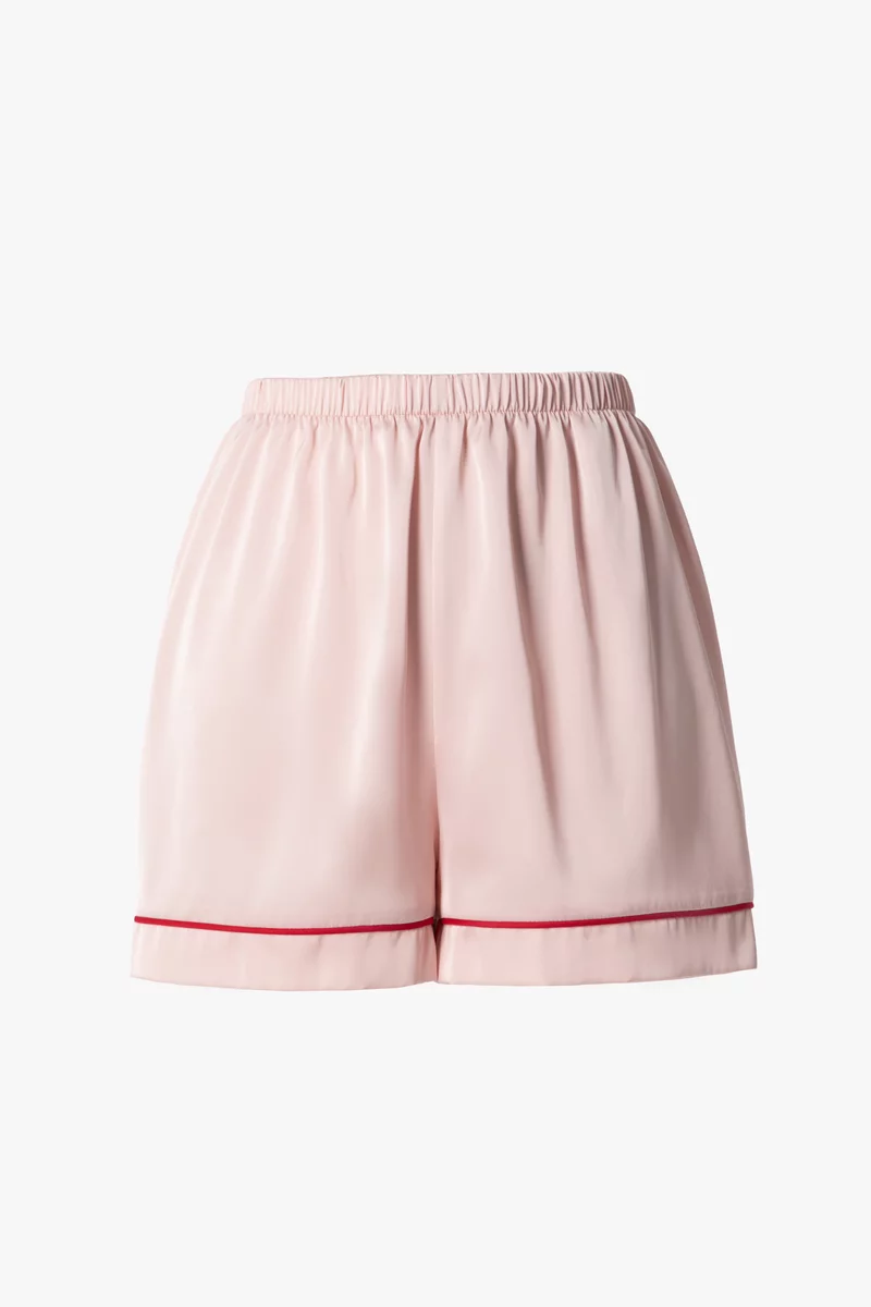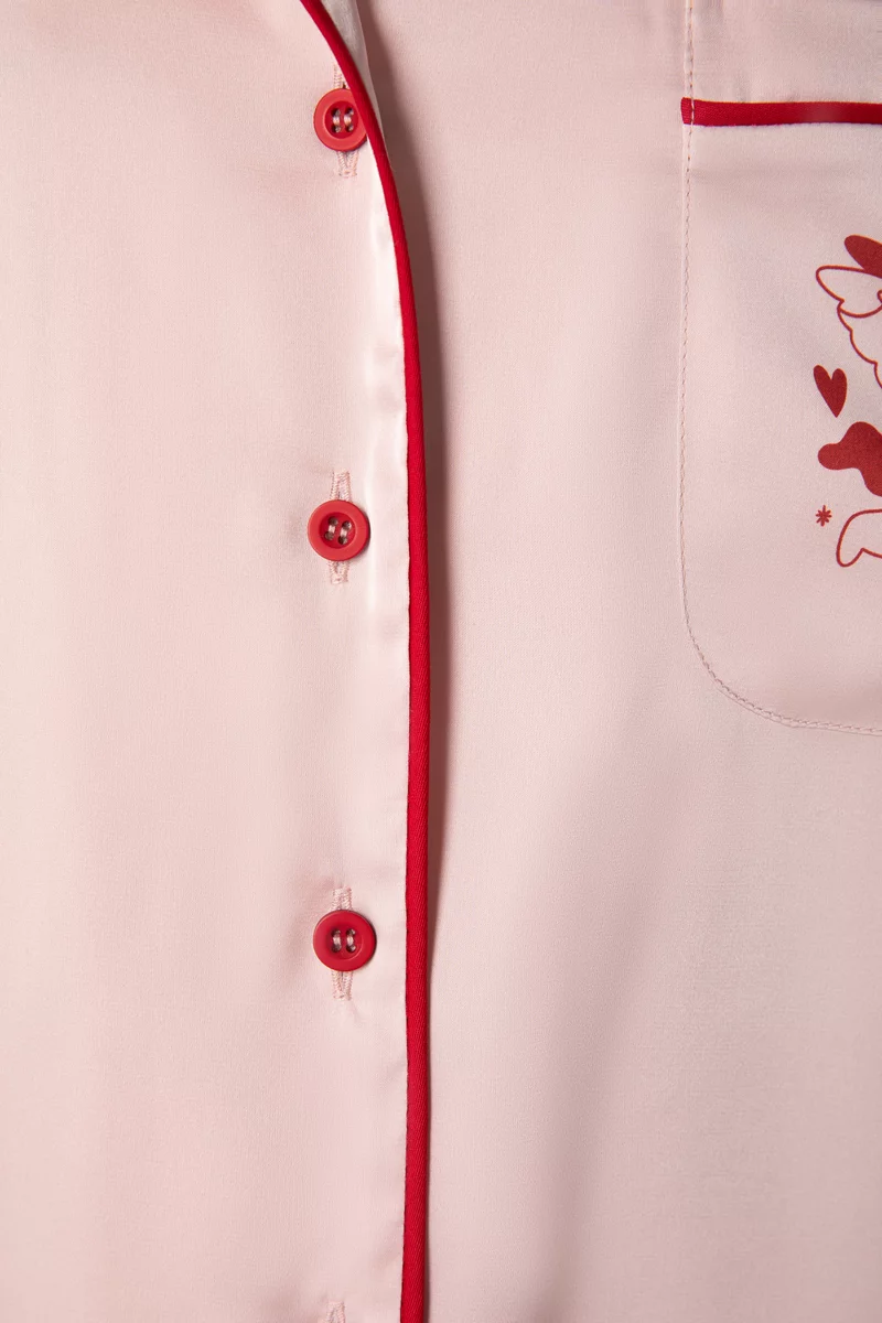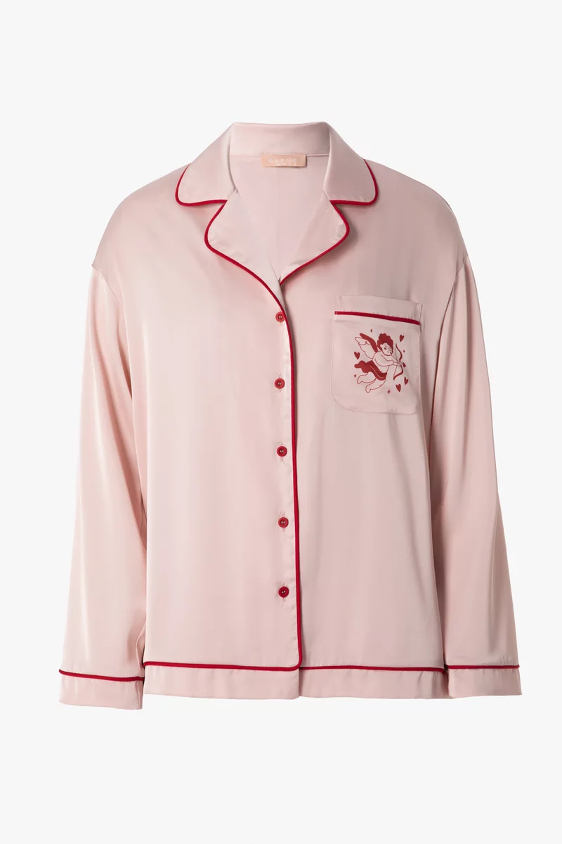 Пижамный комплект из искусственного шелка состоит из трех элементов: топа на бретелях, коротких шорт и блузы с ангелочком на кармане. С таким комплектом можно создать множество уютных домашних образов
