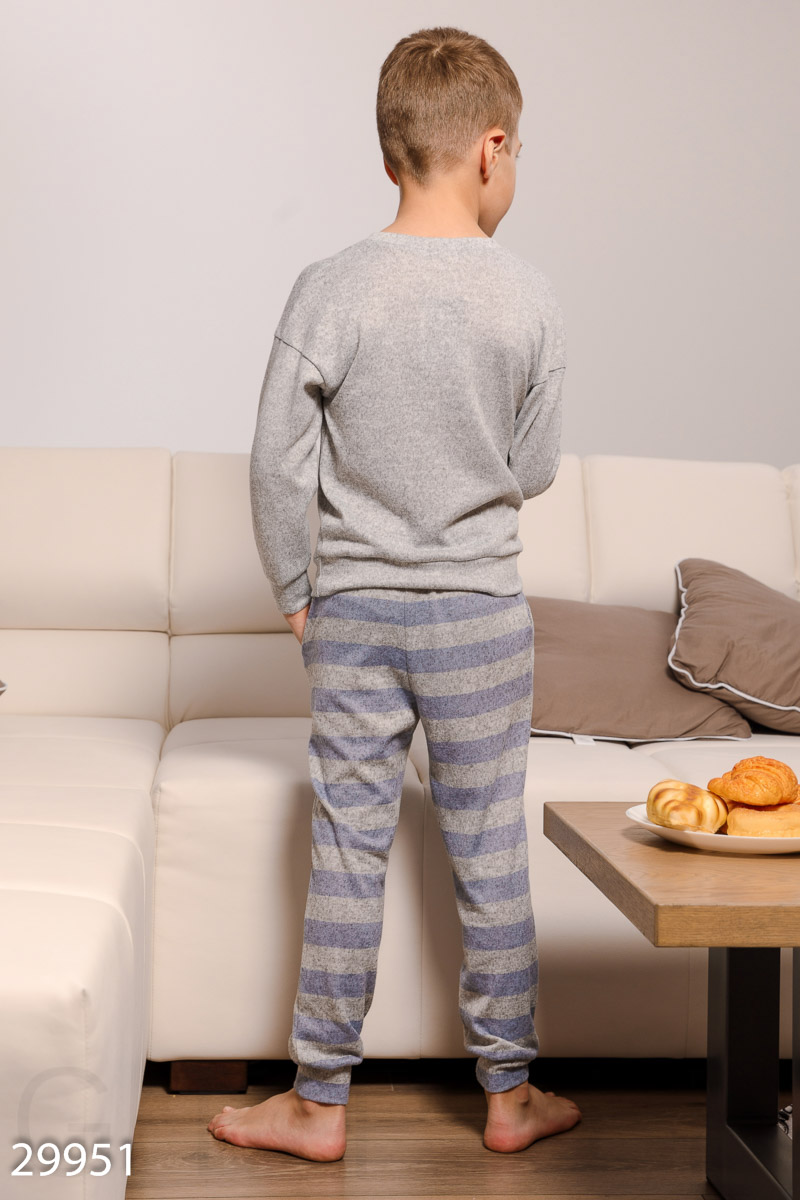 Пижама свободного кроя из мягкой ткани от дизайнеров Gepur: свитшот с круглым вырезом, заниженной линией плеча и длинными рукавами, зауженные книзу брюки на эластичном поясе и манжете, двумя прорезными карманами.
