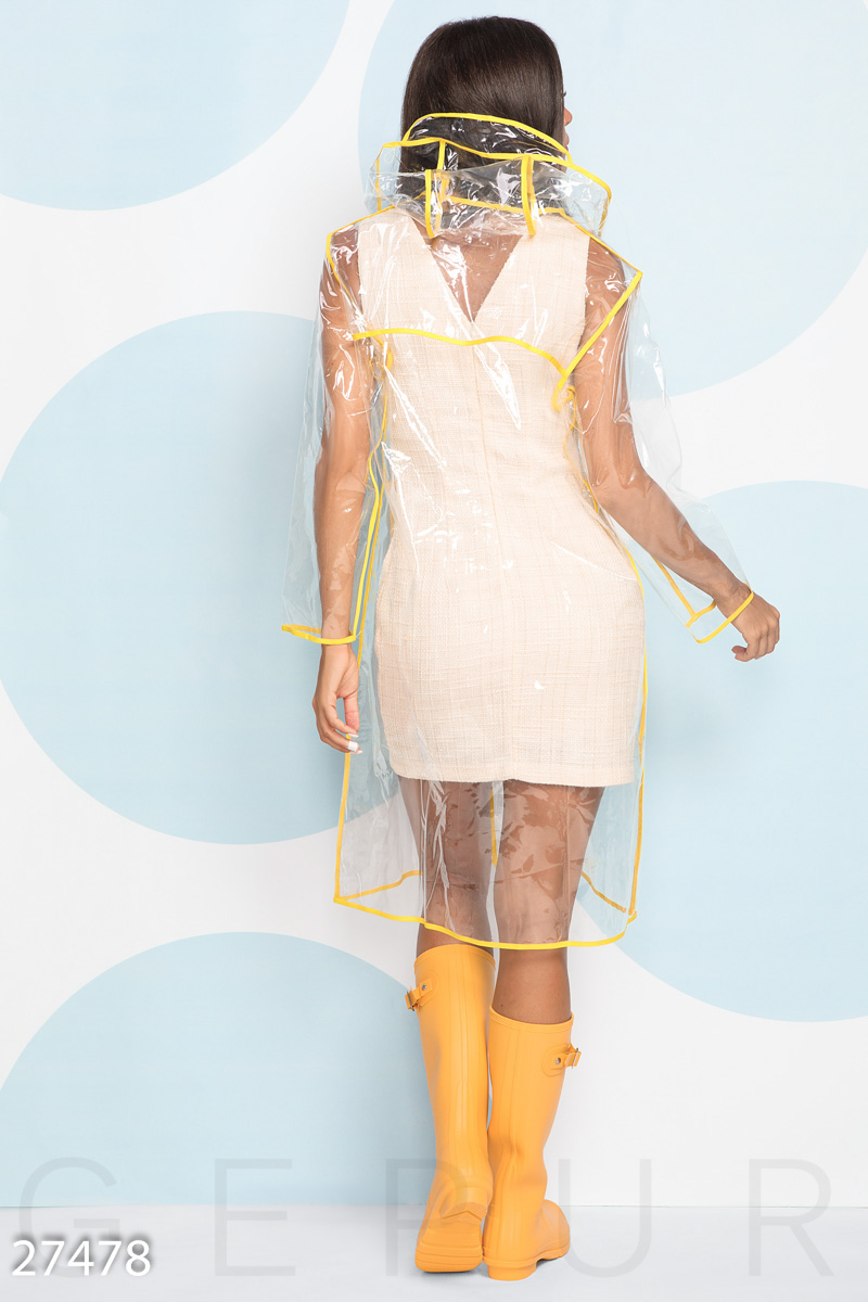 Оригинальный женский дождевик, выполненный из плотного силикона: удобный капюшон с козырьком, боковые карманы-обманки на кнопках и отделка швов желтым кантом.