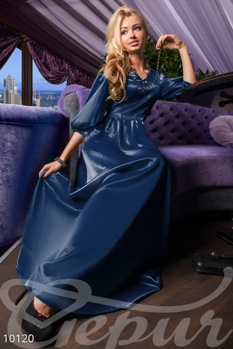 Платье вечернее, в пол, с рукавом 3/4 "фонарик" на манжете, глубокое декольте, юбка-татьянка в сборку. На спине потайная молния.