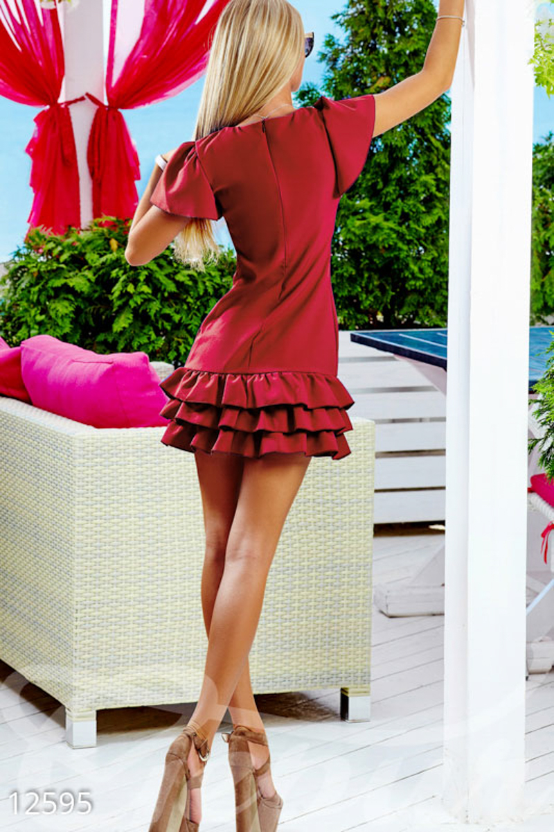 Невероятно красивое коктейльное платье, которое идеально подойдет для вечерних выходов. Воротник-лодочка украшен золотой фурнитурой. Короткие рукава-крылышки придают платью еще более нарядный вид. А подол с объемными рюшами сделает ноги визуально стройнее.