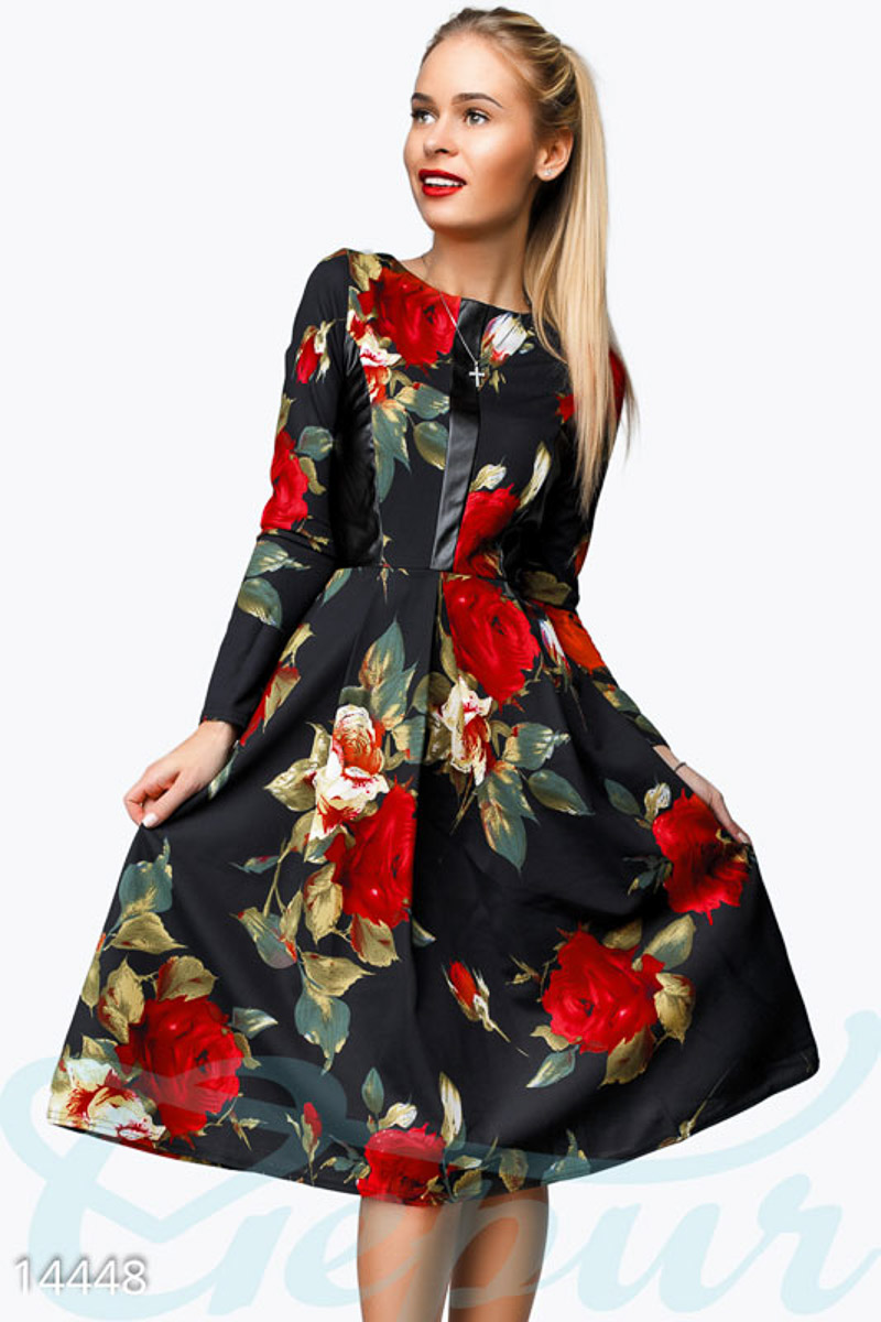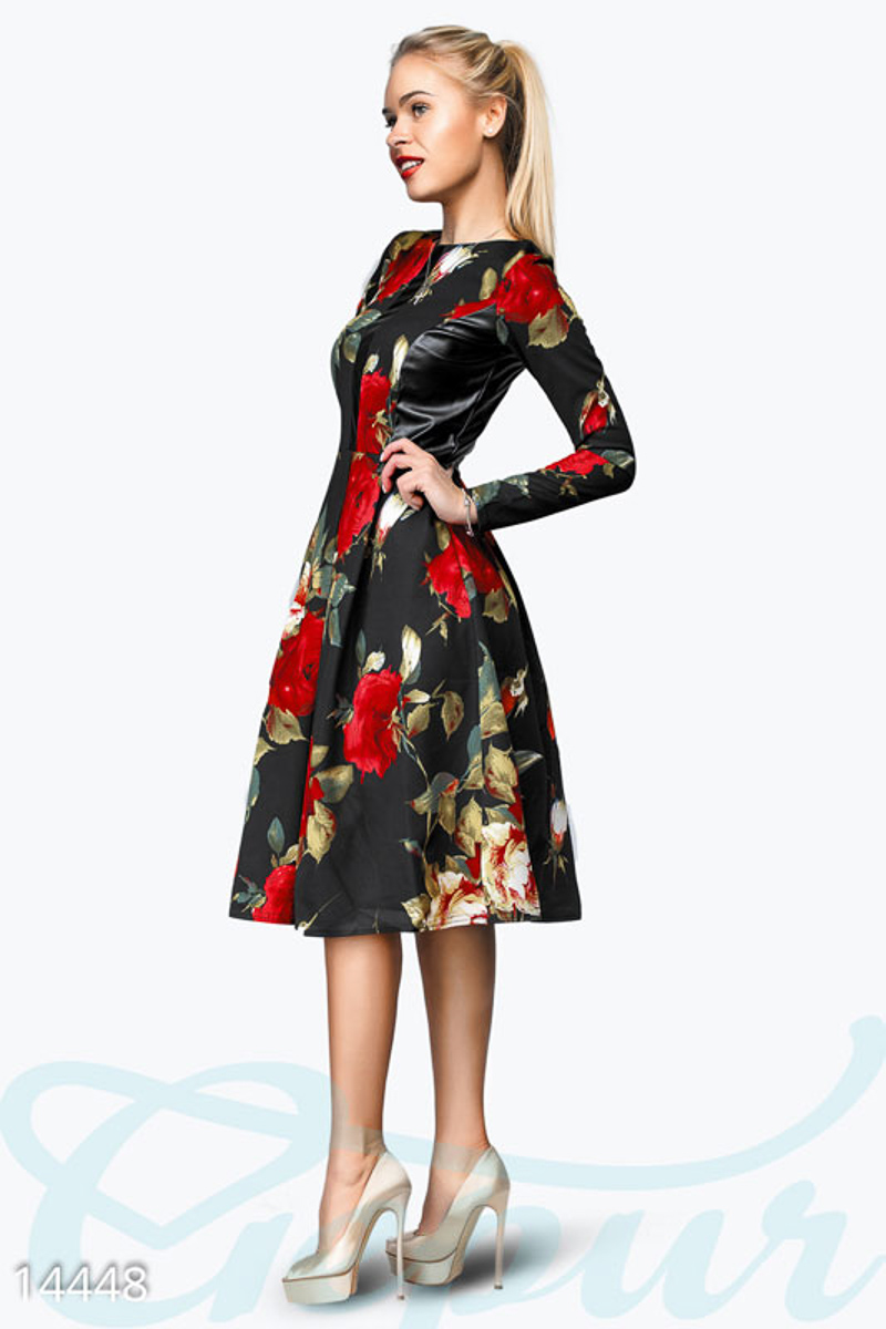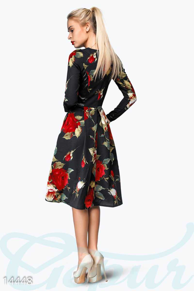 Невероятно женственное платье с крупным цветочным принтом, в котором любая девушка почувствует себя королевой. Вверху украшено вставками из экокожи. Приталенный силуэт и расклешенная юбка помогут подчеркнуть ваши естественные формы. На спинке застегивается на потайную молнию. В этом наряде вы можете отправится на свидание, на прогулку с друзьями или в кино, выбор за Вами!