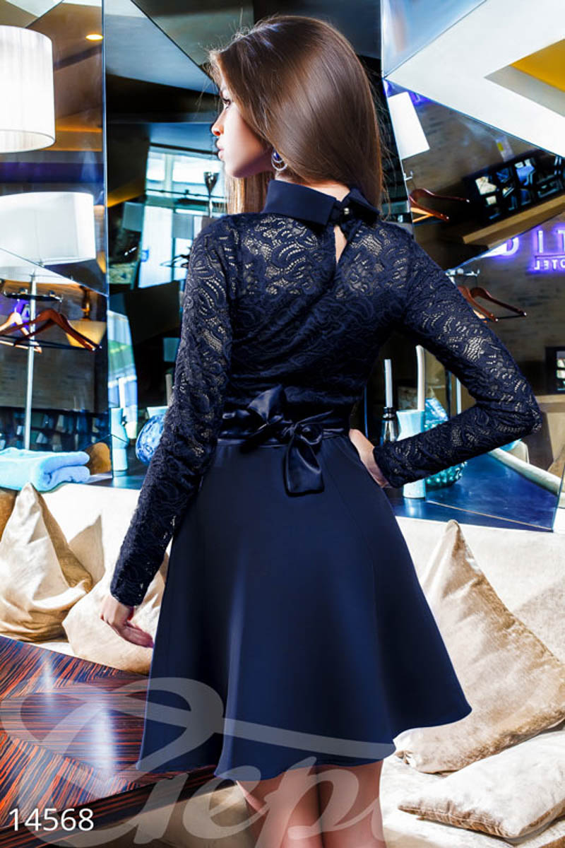 Очаровательное платье А-силуэта, выполненное из гипюра на трикотажной основе: строгий отложной воротник с пришивным бантиком, прозрачная кокетка и рукав, пышная юбка с мягкими складками и съемный атласный пояс в тон.