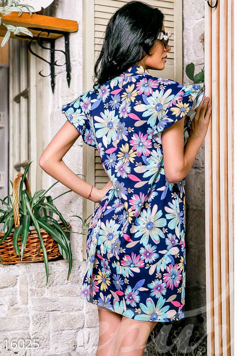 Джинсовое мини-платье с интересным цветочным рисунком и плавной строчкой по подолу юбки. Жёсткий воротничок выгодно подчёркивает шею, а небольшие «крылышки» делают платье ещё более женственным. Наличие карманов делает эту модель по-настоящему стильной и практичной.