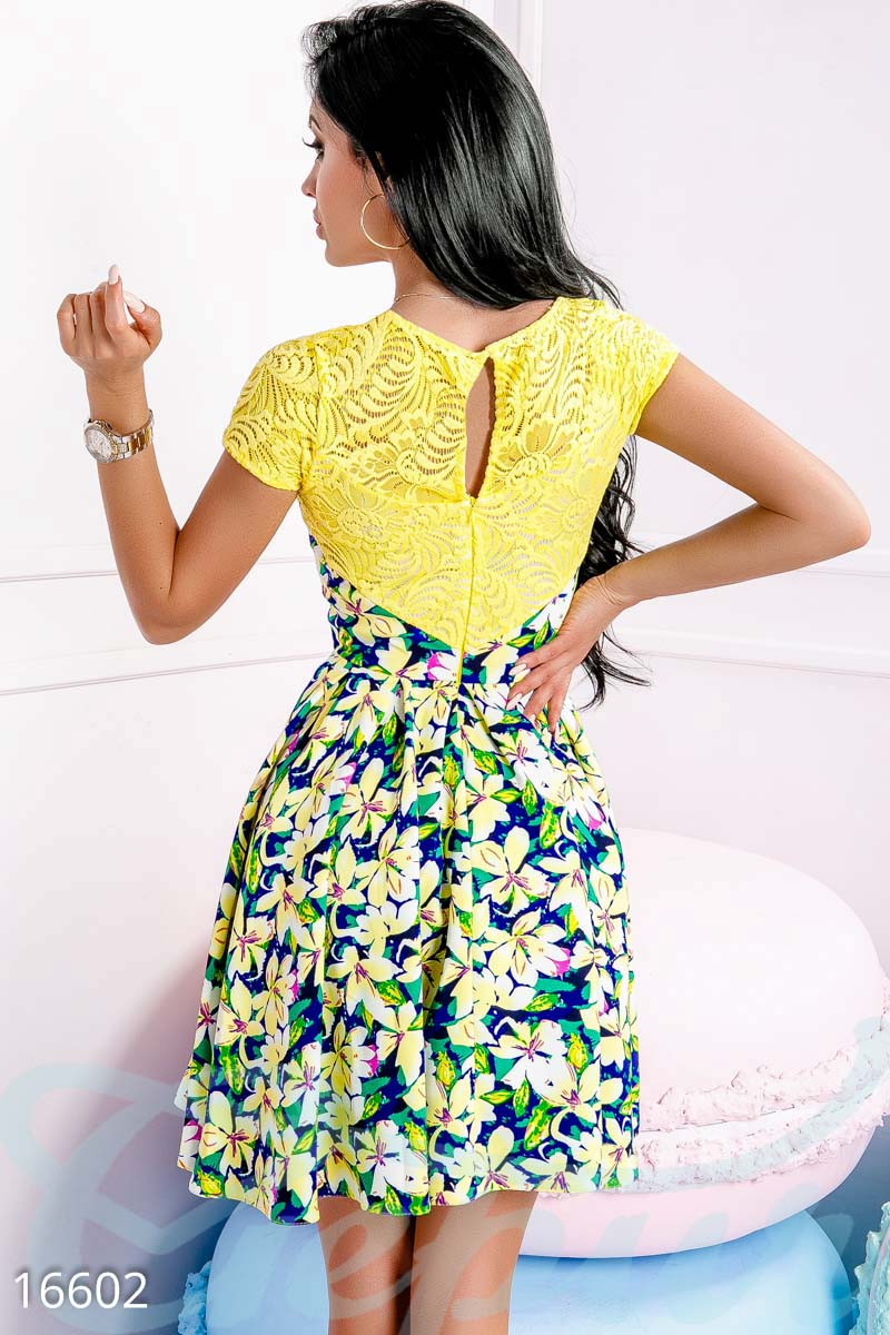 Яркое коктейльное платье из плотного полотна с глянцевым блеском: лаконичная кокетка и короткий рукав, выполненные из гипюра, небольшой разрез на спинке и пышная юбка с цветочным принтом и мягкими складками.