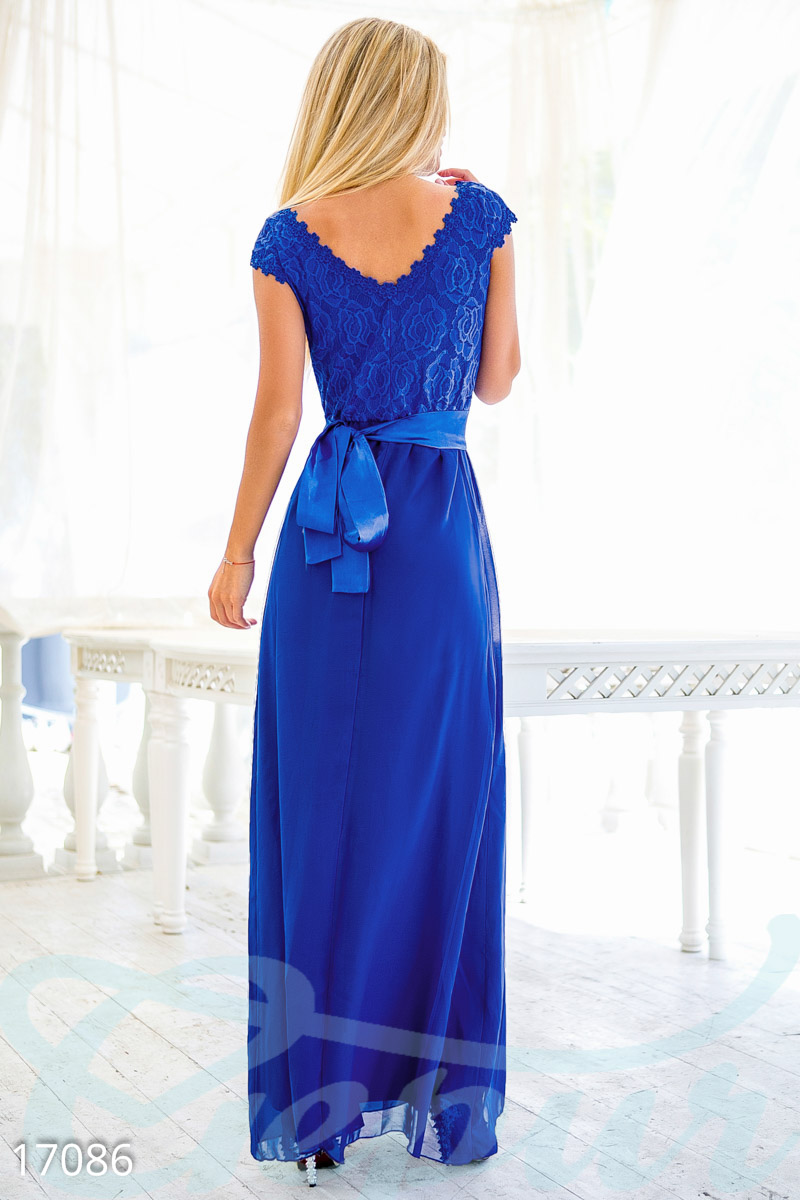 Это вечернее платье - элегантность, заключенная в простом декоре. Модель отличается отсутствием броских деталей и вычурных элементов, что делает ее уместной для любого event. Платье изготовлено из комбинированных материалов: верх из тонкого гипюра на атласной основе, низ - из струящегося шифона на подкладке из трикотажа. На талии предусмотрена втачная резинка и съёмный атласный пояс, а на спинке – небольшой треугольный вырез. Дополняет модель нежный кант из тканного кружева, нашитый вдоль линии горловины и на рукавах в форме крылышек.