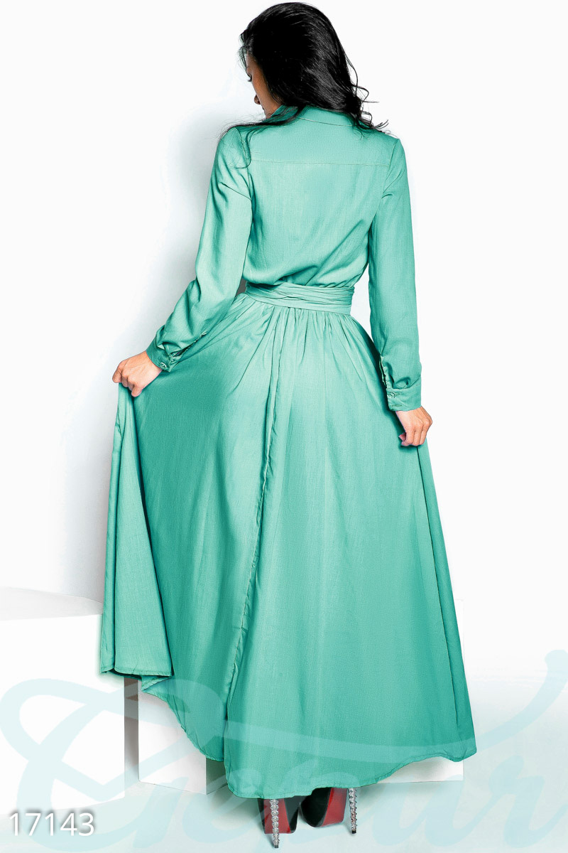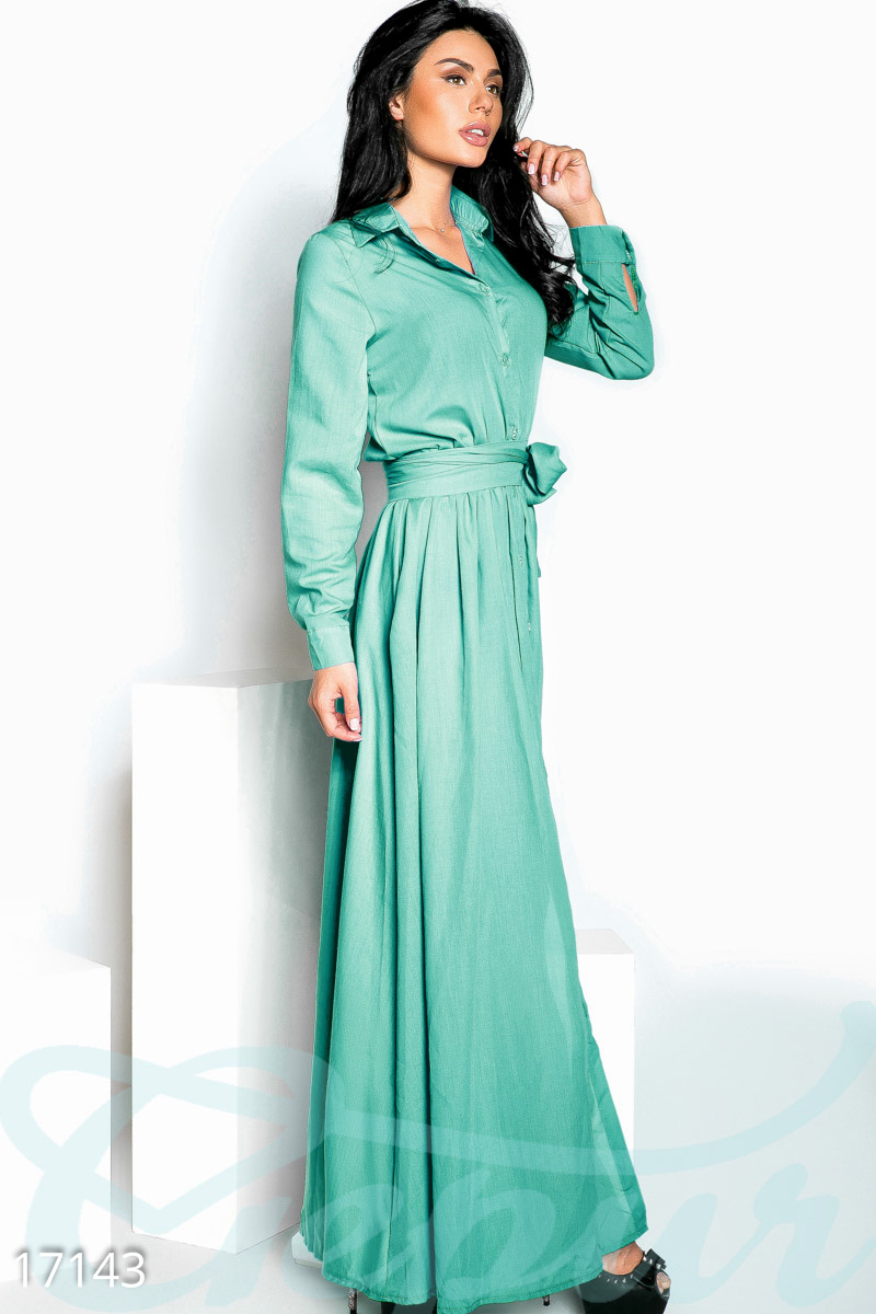 Длинное платье-рубашка в стиле casual сочетает в себе особенности как классической, так и современной одежды. В основе модели положена вертикальная линия в виде застежки на пуговицах, которая визуально вытягивает и стройнит силуэт. Особенностью платья являются манжеты на длинных рукавах, отложной воротник и отдельный пояс на талию. Носить модель рекомендуется с обувью на высоких каблуках.