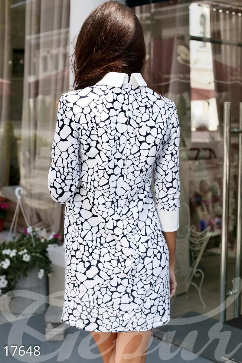 На смену хищному леопарду пришел новый анималистический тренд – окрас жирафа. Более спокойный и жизнерадостный, этот принт смотрится так же экзотично, но совсем не вызывающе. Среди главных особенностей модели - свободный крой со строгим воротничком и белые манжеты. Украшает look съемная брошь из металла, дополненная бусинами и стразами.