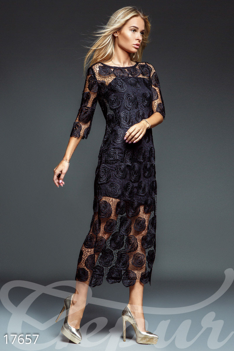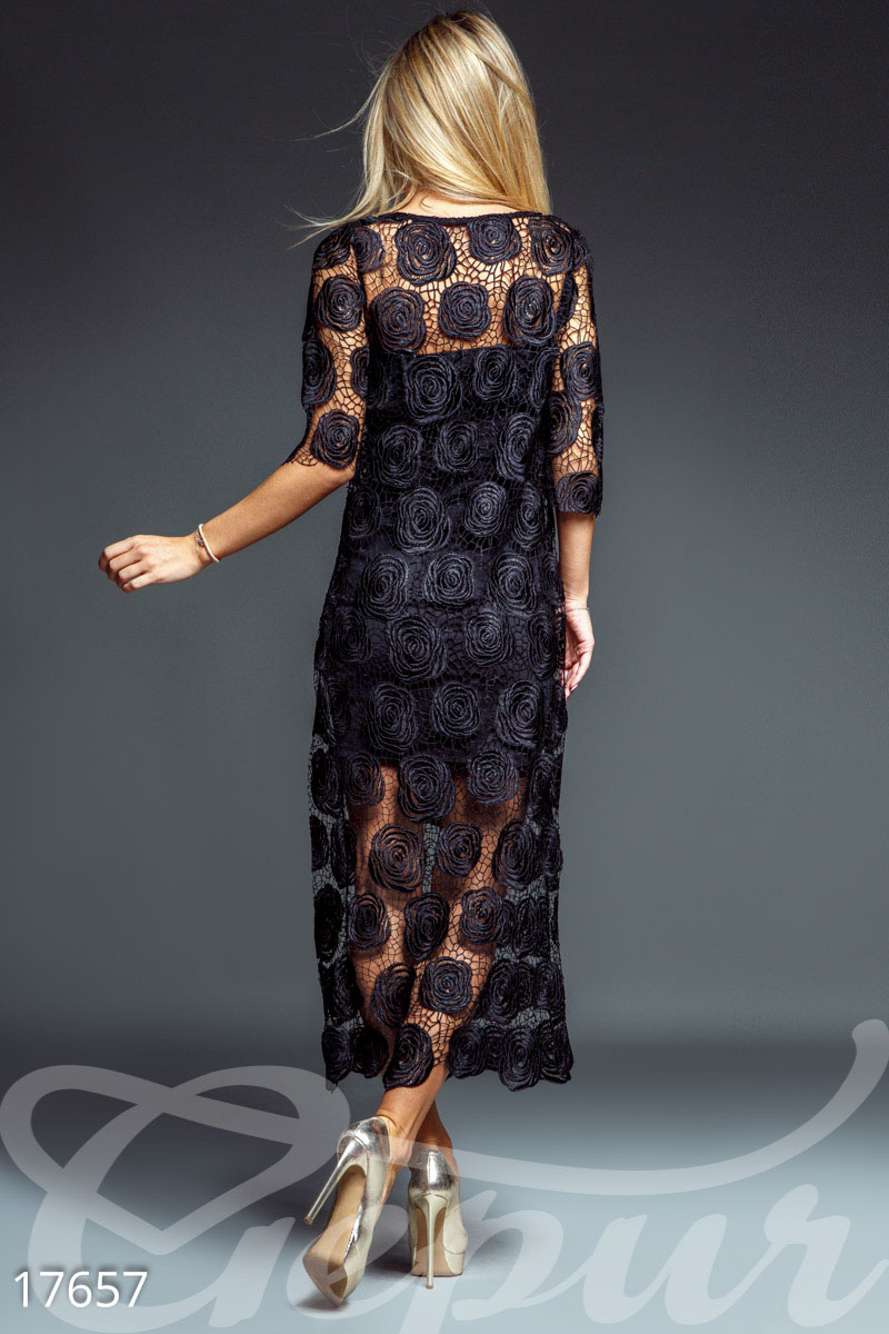 Оригинальное платье из мягкого гипюра, которое включает в себя платье-основу на тонких бретелях, выполненное из эластичной ткани, и длинное платье-сетку с рукавом ¾.