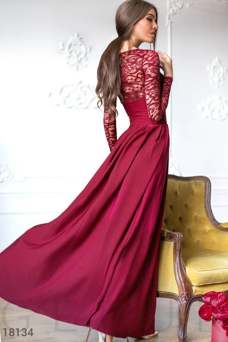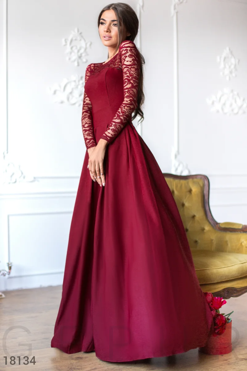Эффектное вечернее платье, выполненное из струящейся ткани: прозрачная гипюровая кокетка и рукав, лиф-бандо, широкий втачной пояс и длинная расклешенная юбка с мягкими складками.