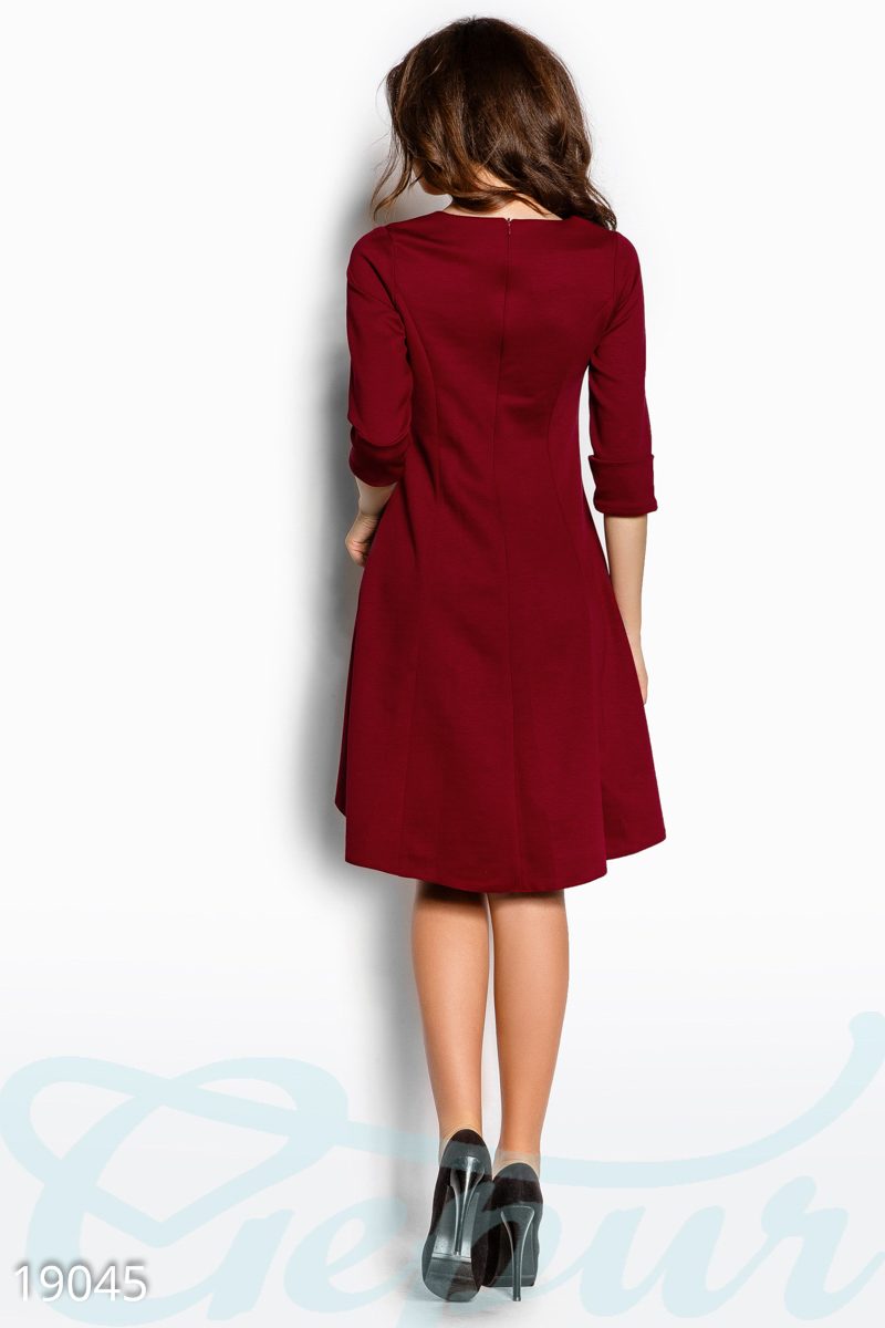 Стильное трикотажное платье асимметричного кроя с рюшами на груди, рукавом ¾ с манжетой и юбкой с удлиненной спинкой.