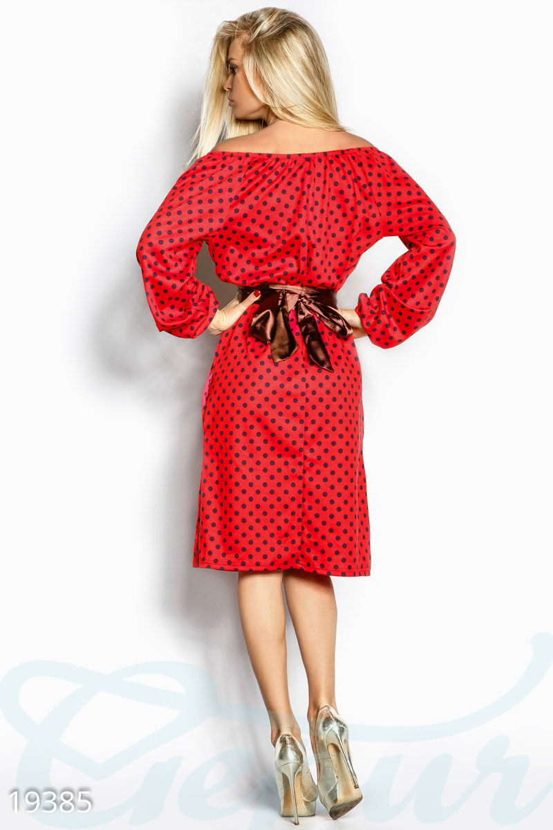 Универсальное трикотажное платье в горошек: широкий вырез горловины с эластичной вставкой, пышный рукав с эластичной манжетой, расклешенная юбка с двумя карманами в швах и съемный пояс-оби из атласа.