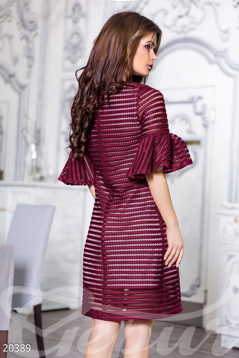 Оригинальное силуэтное платье с воланом на рукаве, выполненное из прозрачного полотна на контрастной основе.
