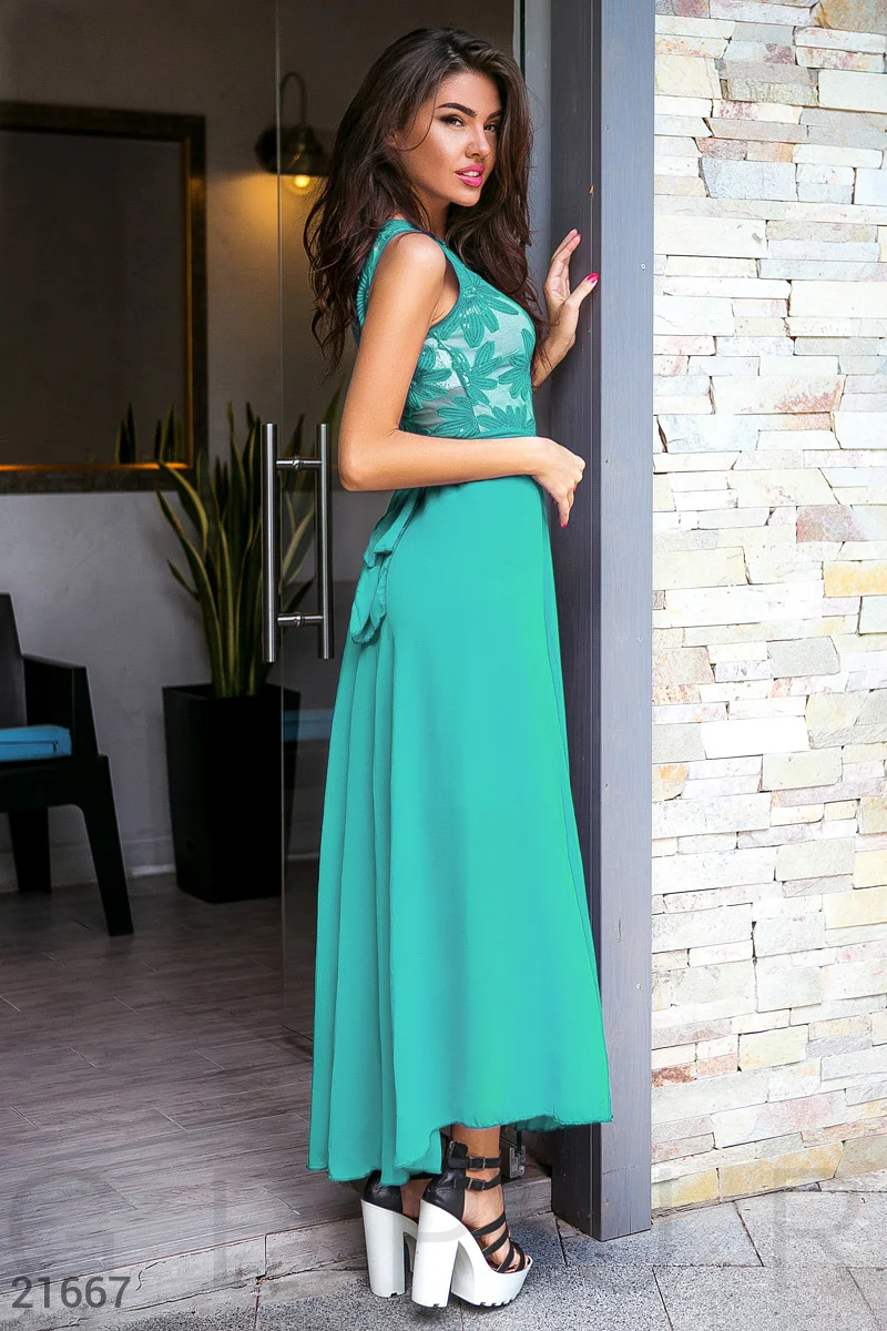 Платье потрясающее! Юбка безумно красиво струится. Цвет, как на фото. Верх в ОГ не тянется почти. Выбирали в размер по размерной сетке продавца. Все подошло.
