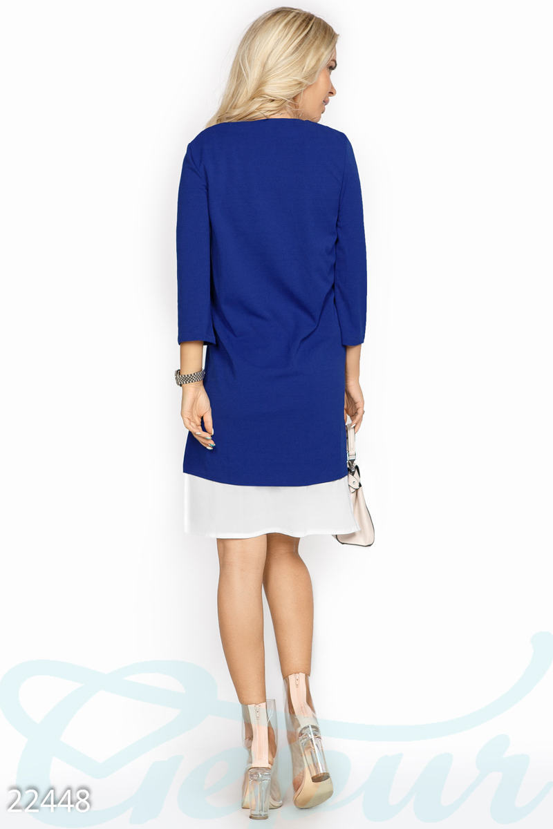 Оригинальное многослойное платье, выполненное из комбинированной ткани: платье-трапеция свободного кроя с v-образным вырезом и рукавом 3/4, легкая шифоновая основа с двумя разрезами по бокам.