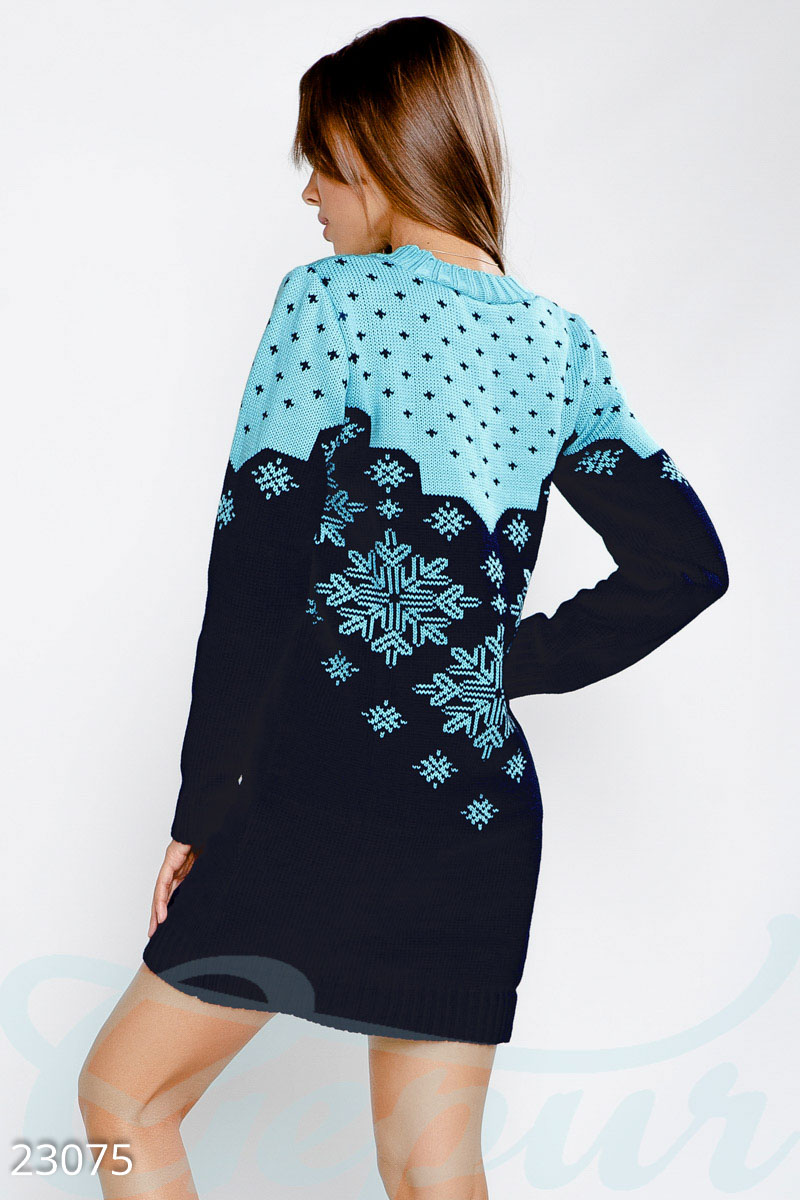 Двухцветное теплое платье плотной вязки с тематическими узорами.