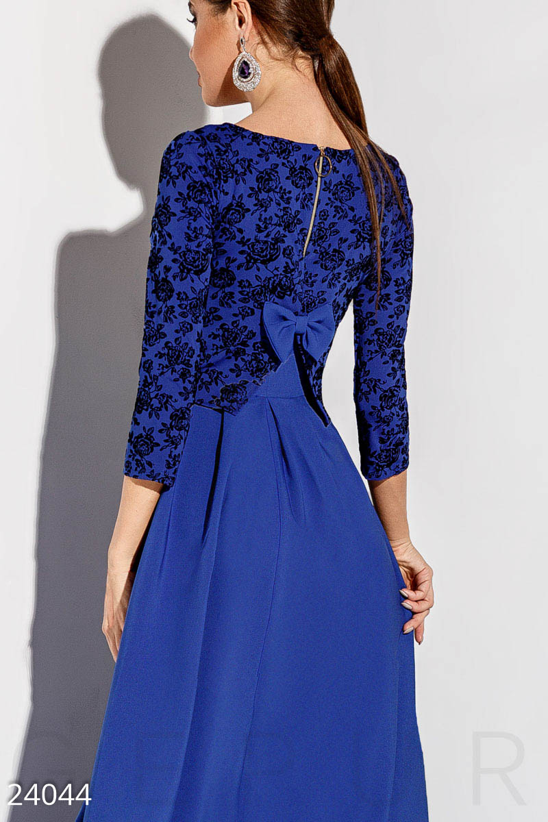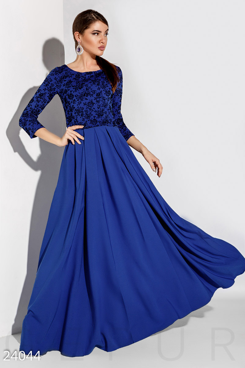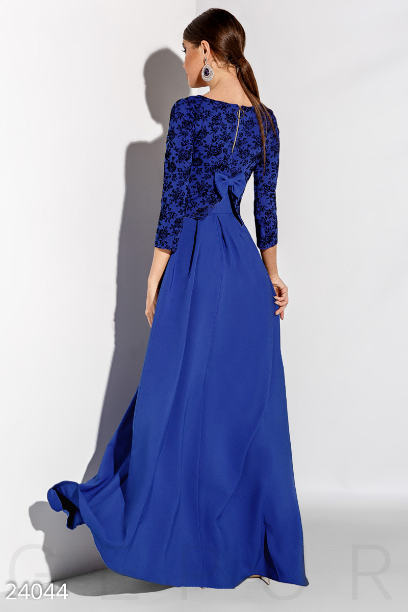 Вечернее платье с длинной пышной юбкой, двумя небольшими карманами, облегающим рукавом 3/4 и эффектной кокеткой с накидкой-обманкой, выполненной из эластичной ткани с контрастным напылением.