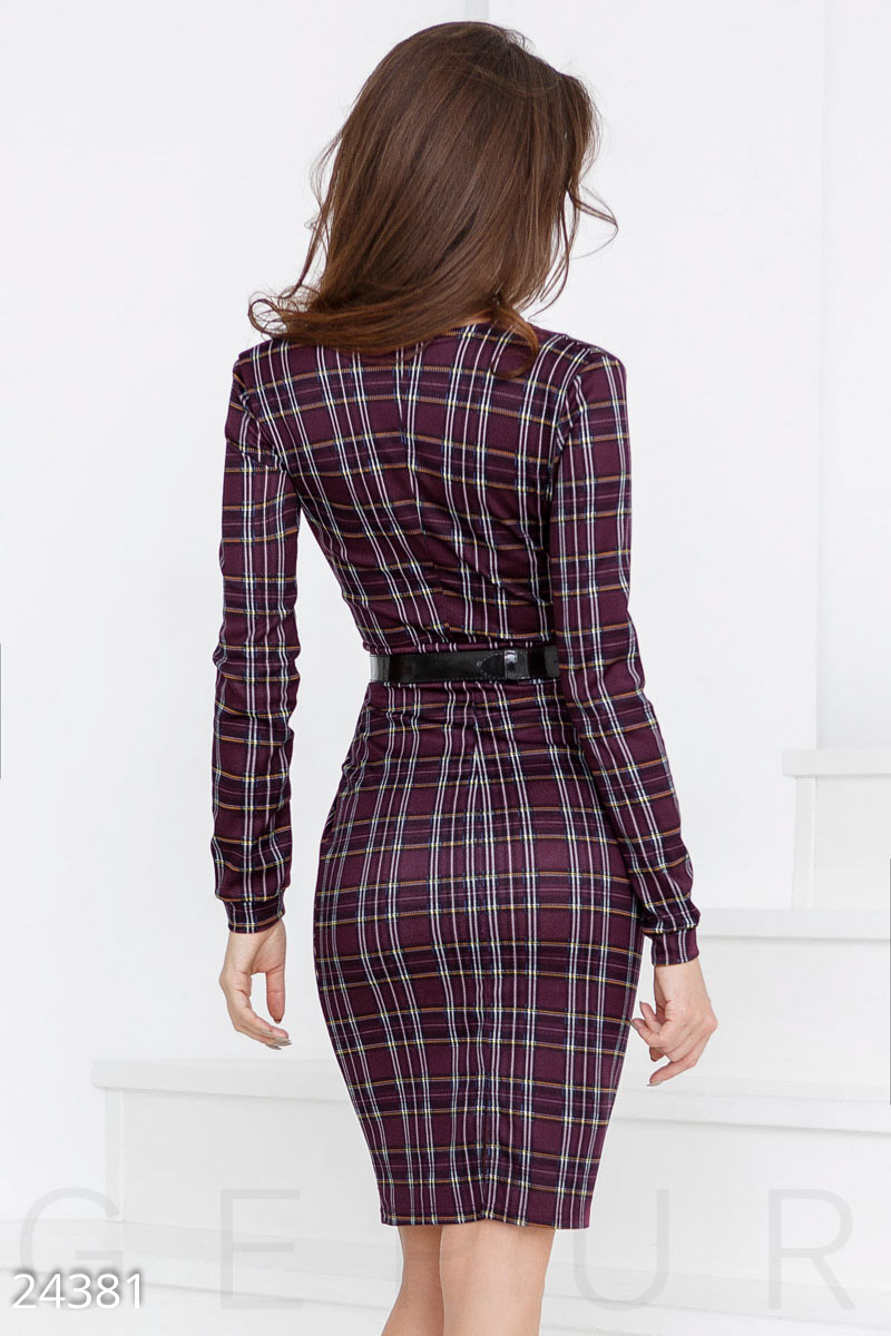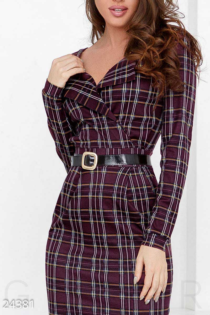 Аккуратное платье-шотландка из мягкого трикотажа: оригинальная кокетка с фиксированным запáхом и лацканами, длинный рукав с манжетой, юбка-тюльпан с небольшим разрезом, два кармана по бокам и съемный ремешок из эко-кожи.