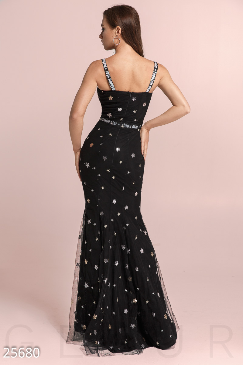Уникальное вечернее платье-годе от дизайнеров Gepur, выполненное из сетки с вышивкой: узкие бретели и пояс - репсовая лента "fashion star", открытая спинка и футляр-основа, в точности повторяющая силуэт платья.