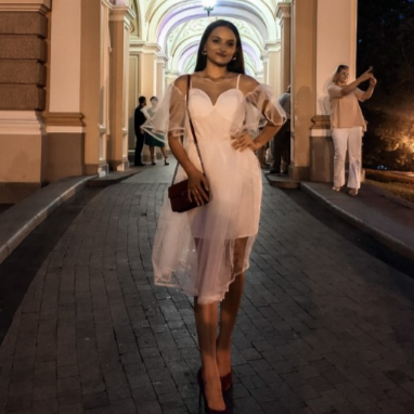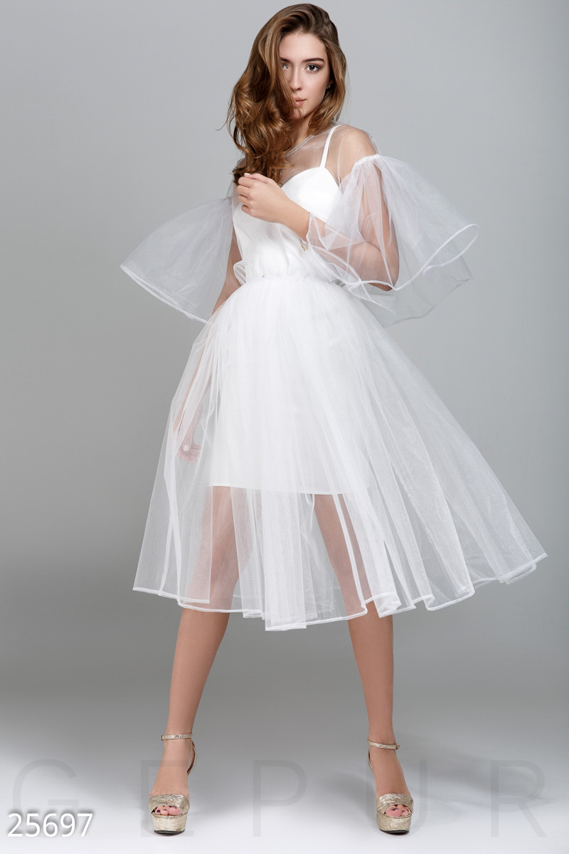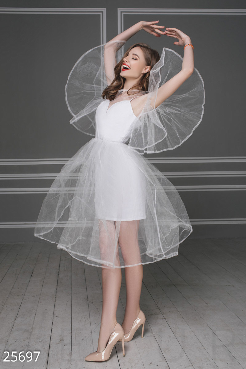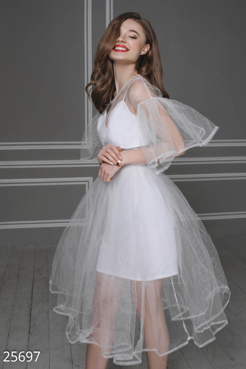 Это платье покорило модниц,очень воздушный и необычный фасон.Клиентки берут на мероприятия,некоторые даже на роспись. Фатин держит форму и жестковат.Идет скорее в размер