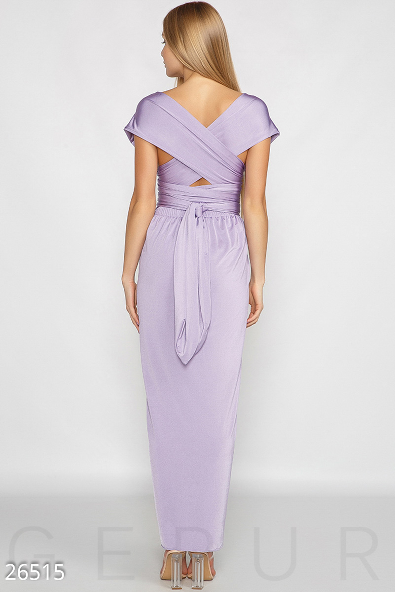 Универсальное платье-трансформер, выполненное из струящейся ткани: юбка-макси с фиксированным запáхом, эластичный пояс и две длинные ленты-завязки.