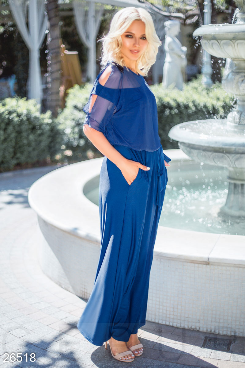 Оригинальное вечернее платье из струящейся ткани: свободный лиф из сетки, контрастные аппликации на плечах, эластичная вставка на поясе, два кармана в швах, юбка с боковым разрезом и съемный пояс в тон.