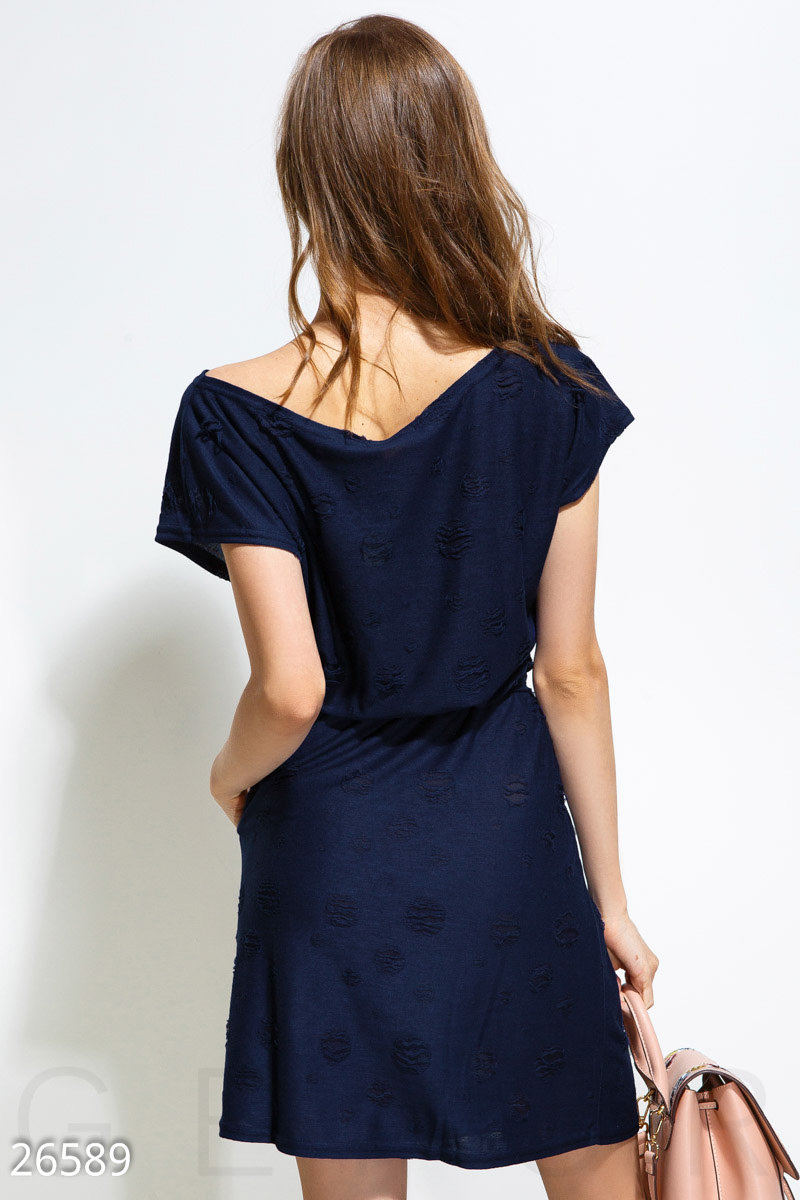 Мягкое пляжное платье-туника из трикотажа с разрывами: вырез-лодочка, эластичная вставка на поясе, два кармана в швах и съемный пояс в тон.