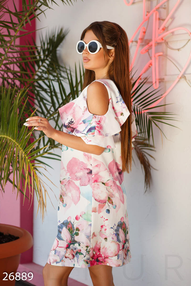 Материал плотноватый на лето, больше на весну подойдет. Принт такой же яркий, красивый, полностью соответствует фото. Замеры в 4хл: Ог 108 см, От 106 см, Об 124 см.