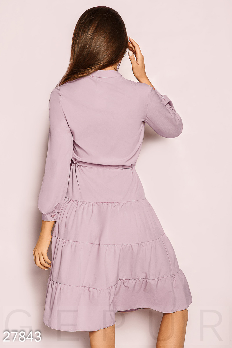 Легкое платье на пуговицах, выполненное из струящейся ткани: кокетка на пуговицах, короткий воротник-стойка, втачной пояс с завязками на кулиске и многоярусная юбка.