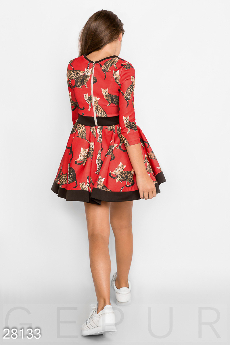 Оригинальное платье с контрастными вставками, принтом "коты", аккуратным рукавом 3/4 и пышной юбкой с подъюбником, выполненным из сетки.