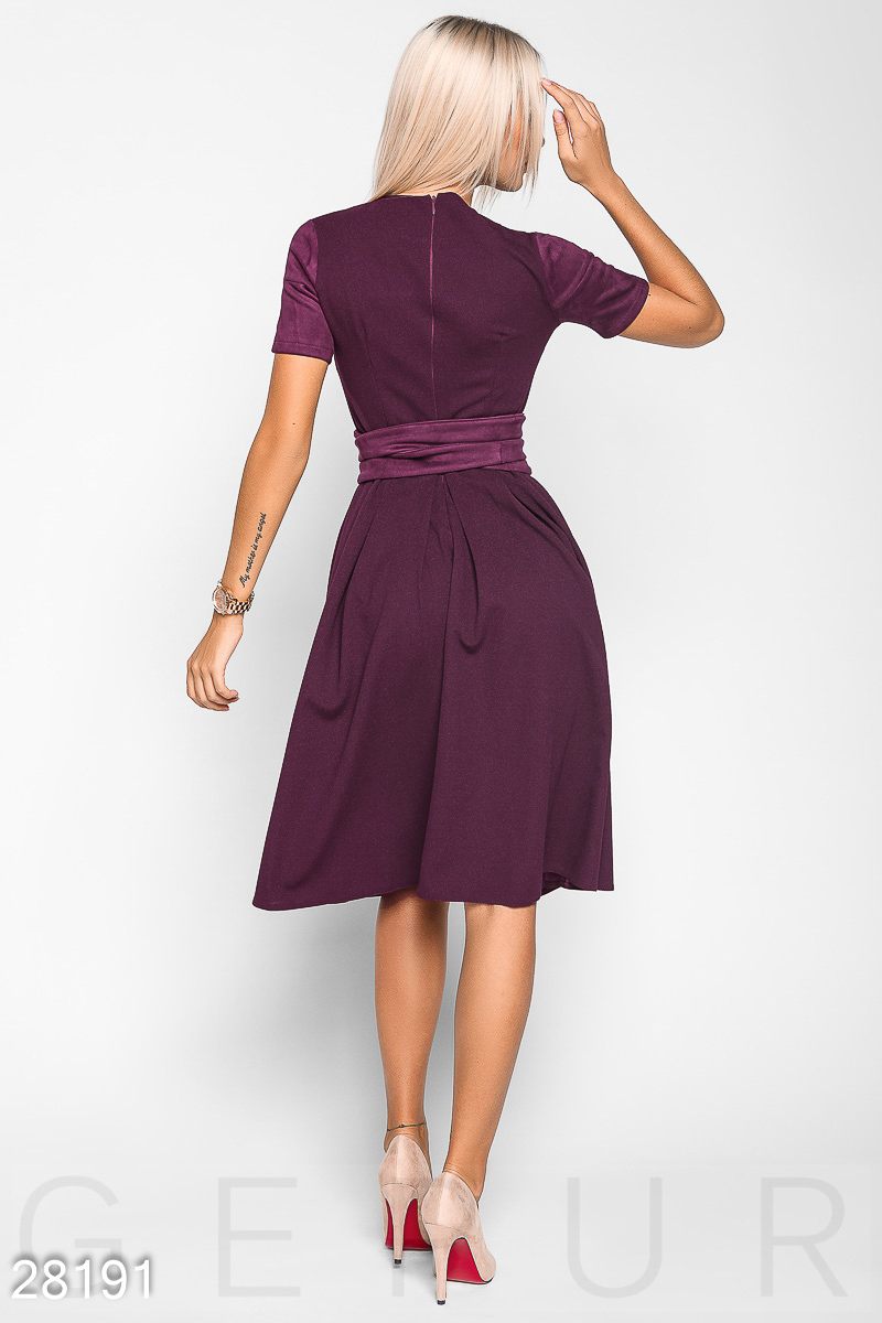 Элегантное платье с коротким рукавом, выполненное из фактурной костюмной ткани: высокий круглый вырез, лаконичная кокетка и рукав из эко-замши, пышная юбка с двумя небольшими карманами в швах и контрастный пояс-оби.