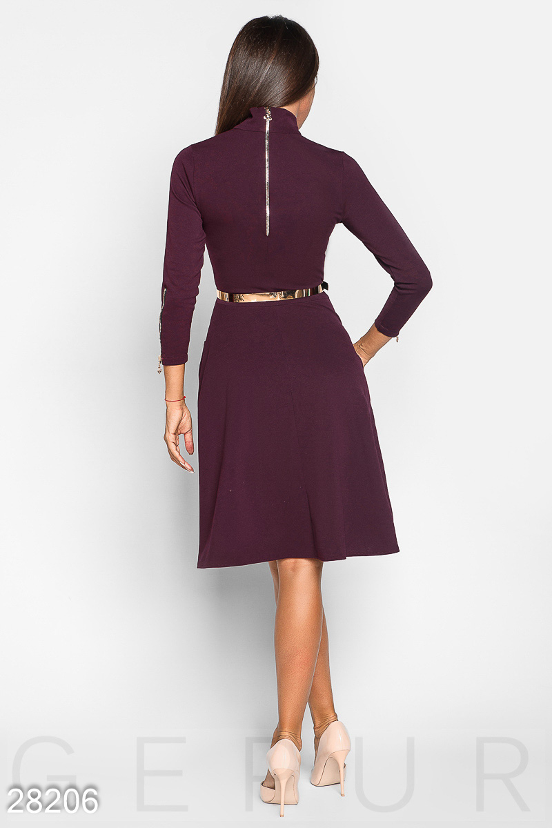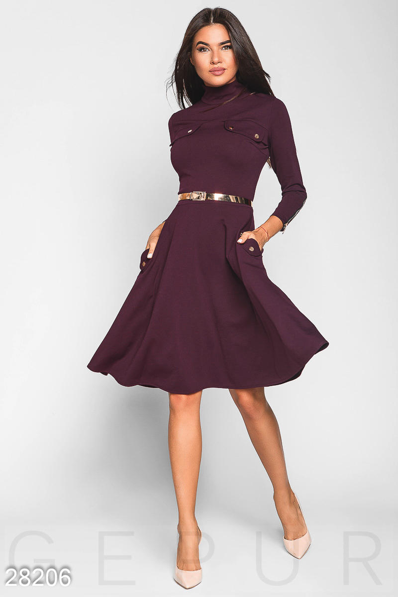 Силуэтное платье, выполненное из мягкой эластичной ткани: высокий воротник-стойка, лаконичный лиф с двумя карманами-обманками, облегающий рукав 3/4 на молнии, расклешенная юбка с двумя карманами по бокам и съемный ремешок из эко-кожи.