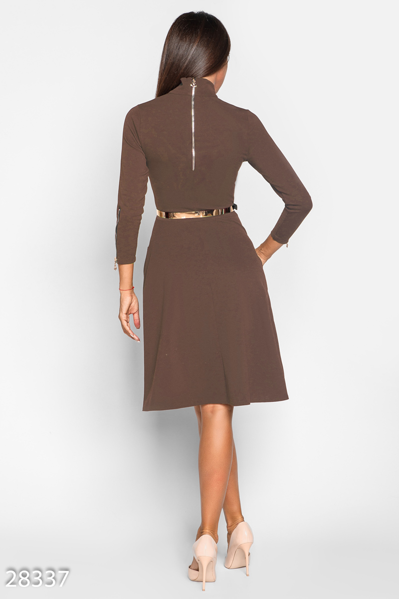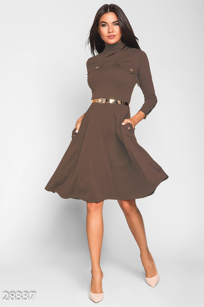 Силуэтное платье, выполненное из мягкой эластичной ткани: высокий воротник-стойка, лаконичный лиф с двумя карманами-обманками, облегающий рукав 3/4 на молнии, расклешенная юбка с двумя карманами по бокам и съемный ремешок из эко-кожи.