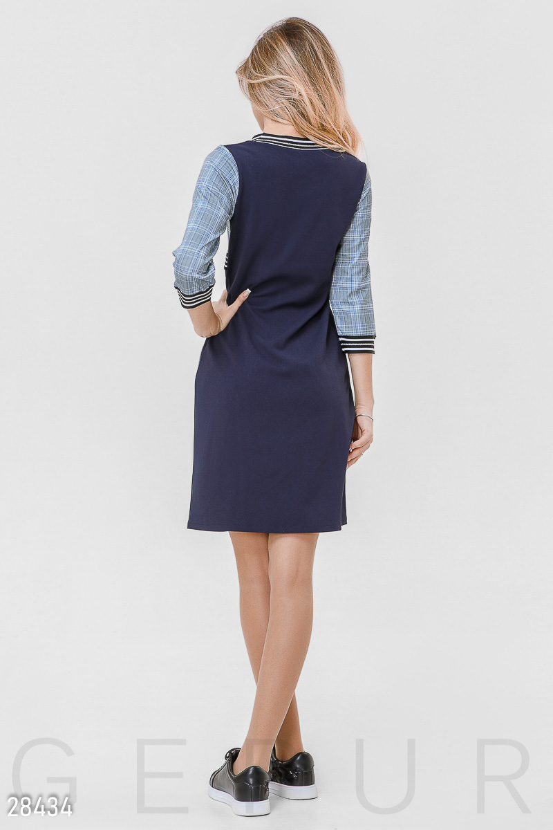 Комбинированное платье, дополненное отделкой стрейчевой лентой: лаконичный лиф и рукав 3/4, выполненные из легкого трикотажа в клетку; юбка на пуговицах с двумя прорезными карманами и завышенной линией талии.