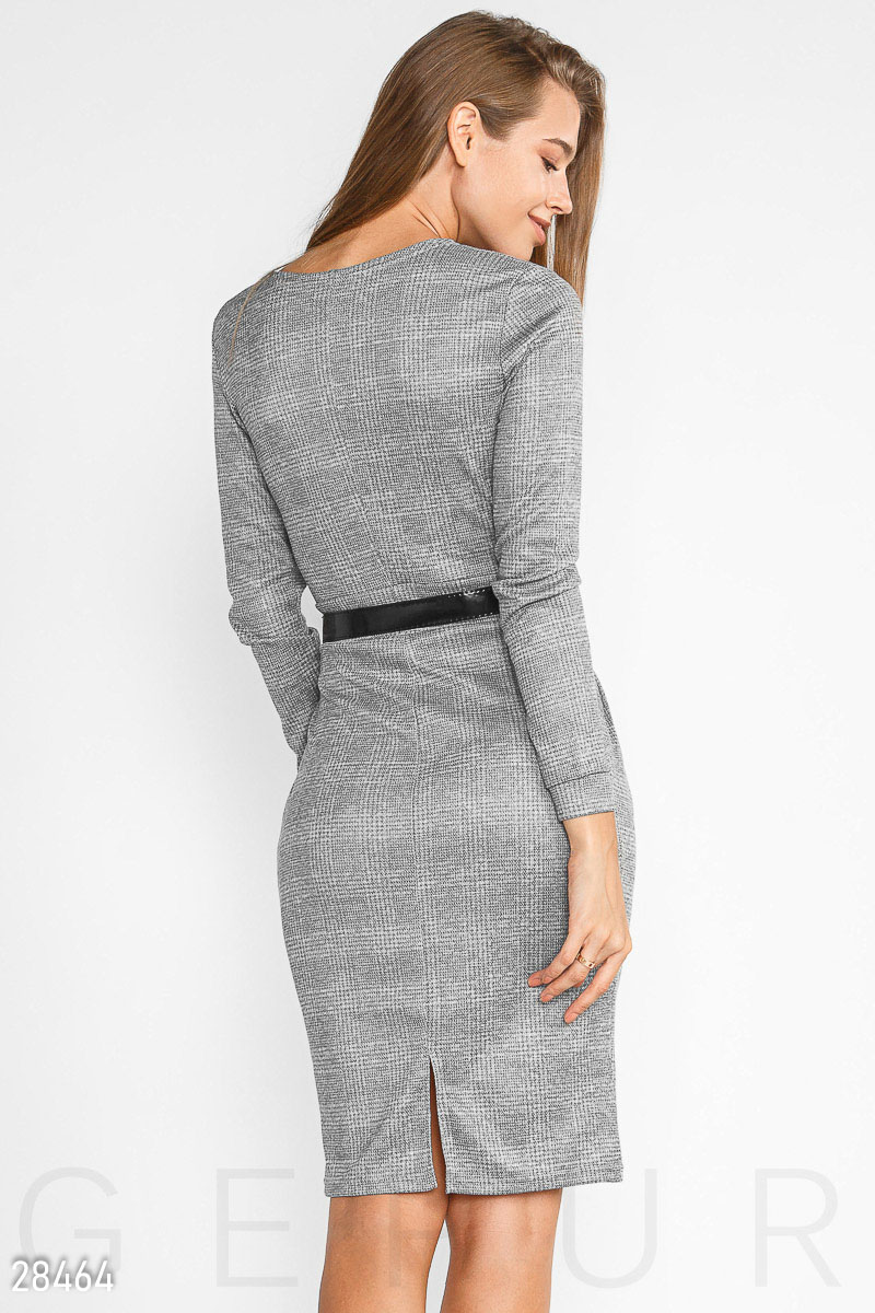 Элегантное женское платье облегающего кроя, выполненное из мягкого трикотажа: фиксированный запáх с лацканами на груди, длинный рукав с эластичной манжетой, втачной пояс и юбка-тюльпан с двумя карманами по бокам и небольшим разрезом сзади.
