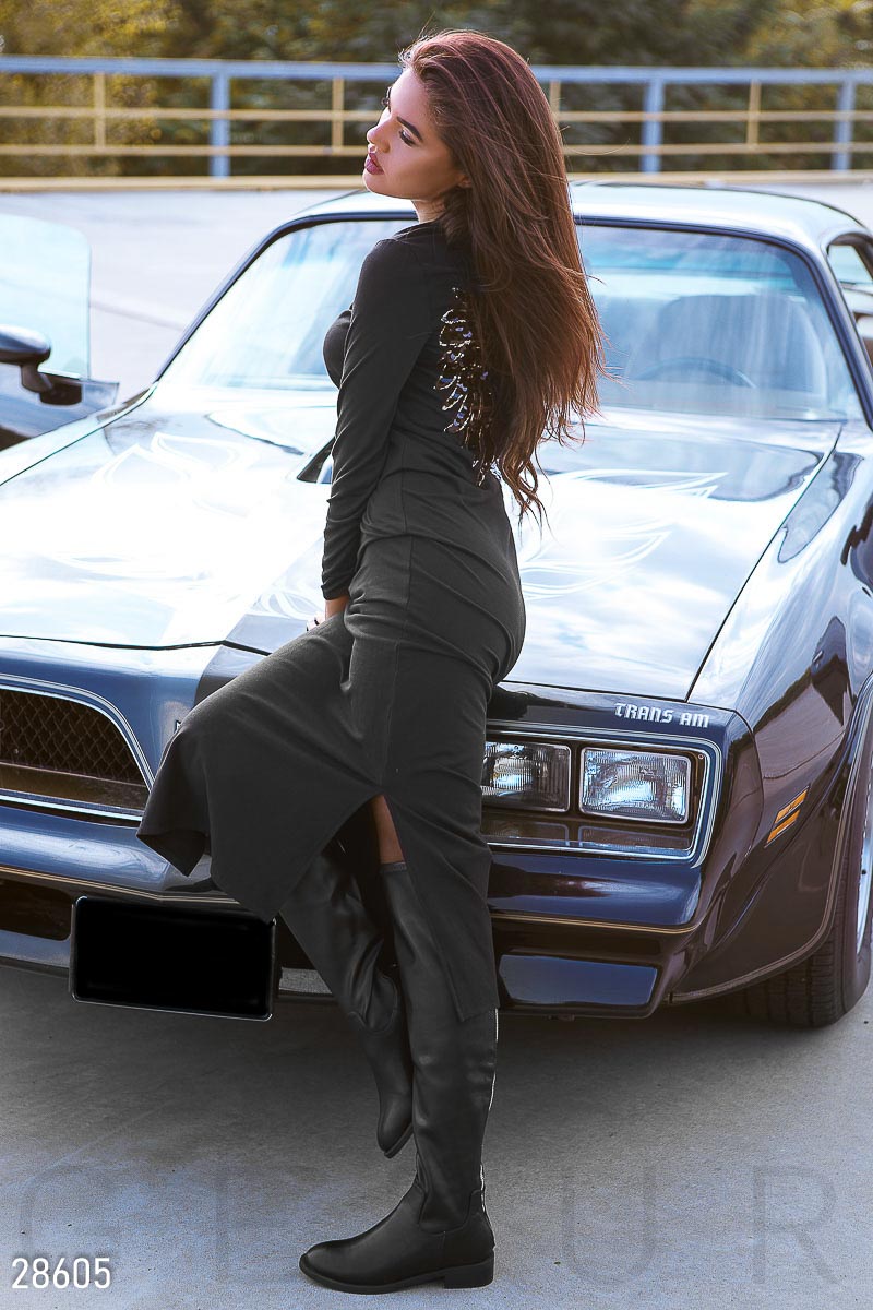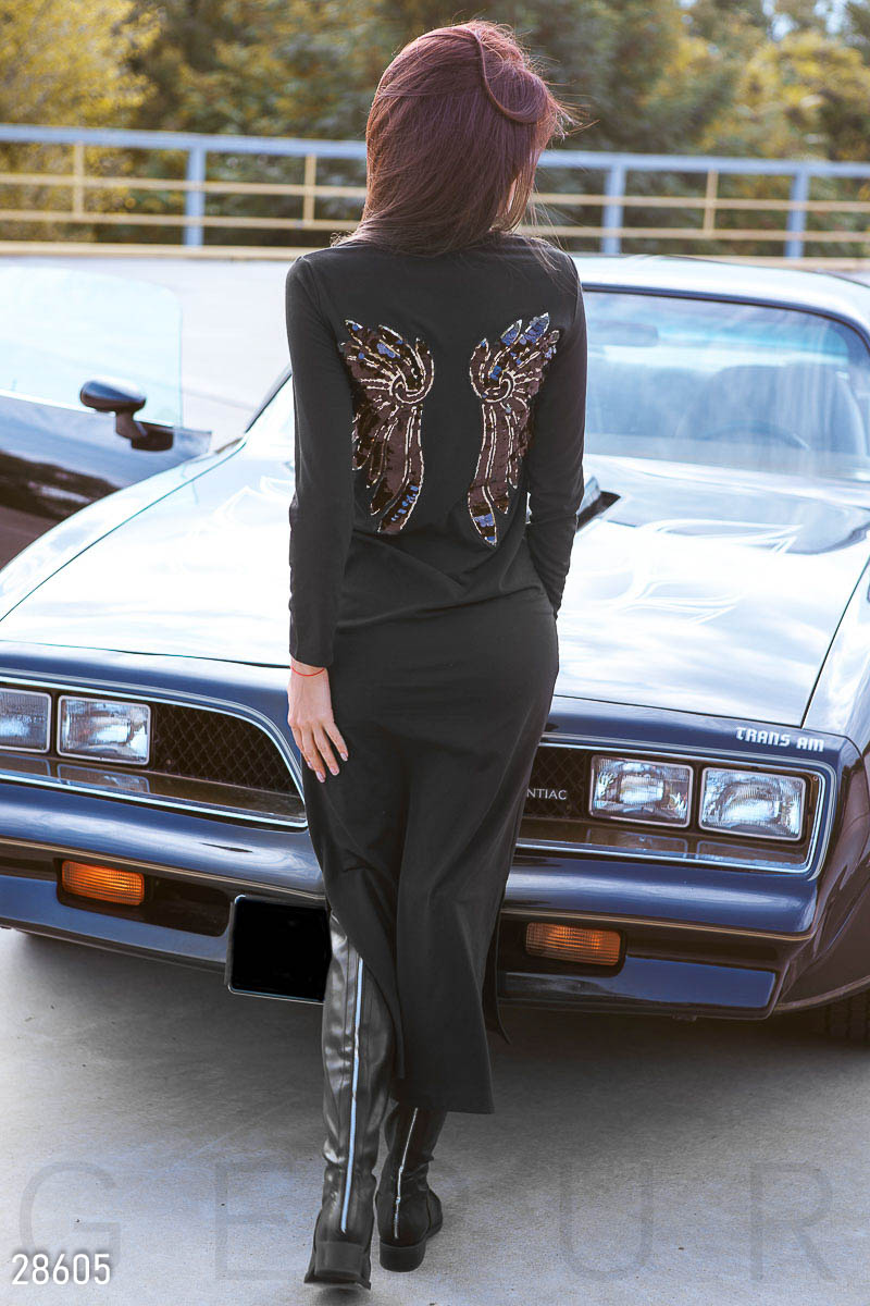 Базовое длинное платье из джерси, дополненное двумя разрезами по бокам и большой аппликацией "крылья" из пайеток на спинке.