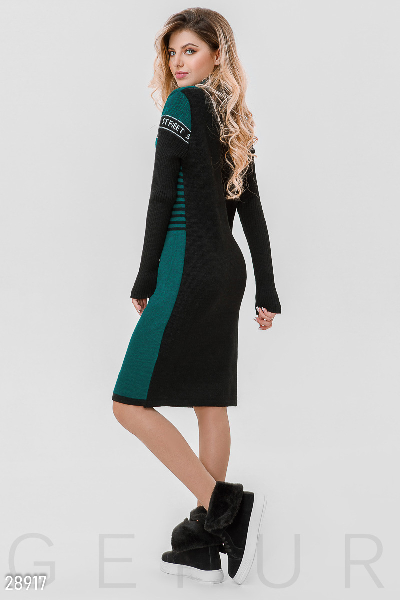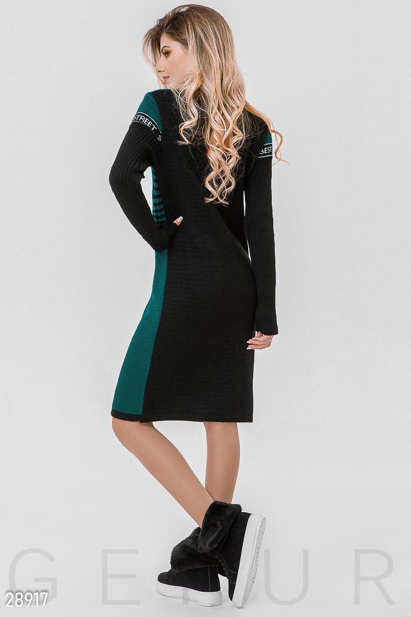 Теплое платье-свитер с высоким воротником и длинным рукавом в рубчик, украшенное тематическими надписями.