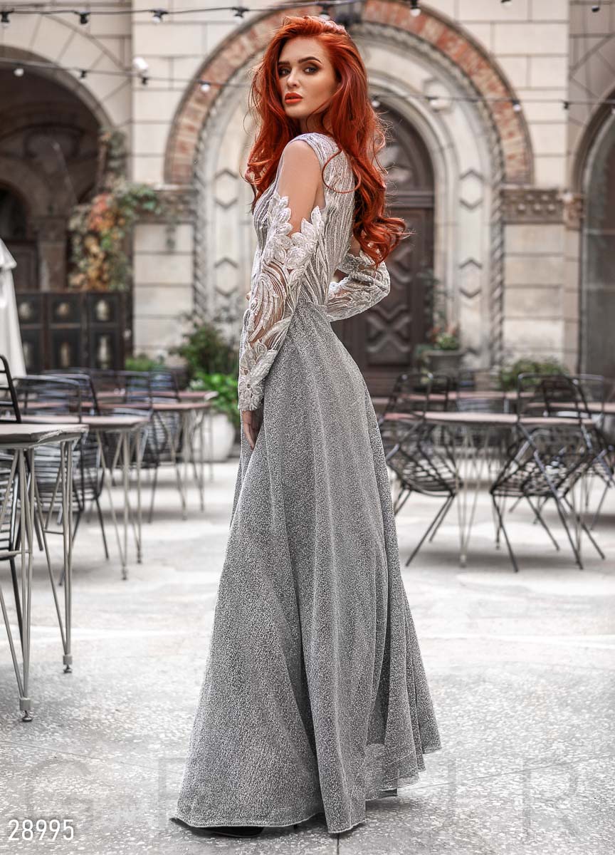 Эффектное вечернее платье с декором: верх выполнен из сетки с фигурной вышивкой и небольшими пайетками в тон, расклешенная юбка-макси с нитью люрекса и слегка завышенной линией талии.