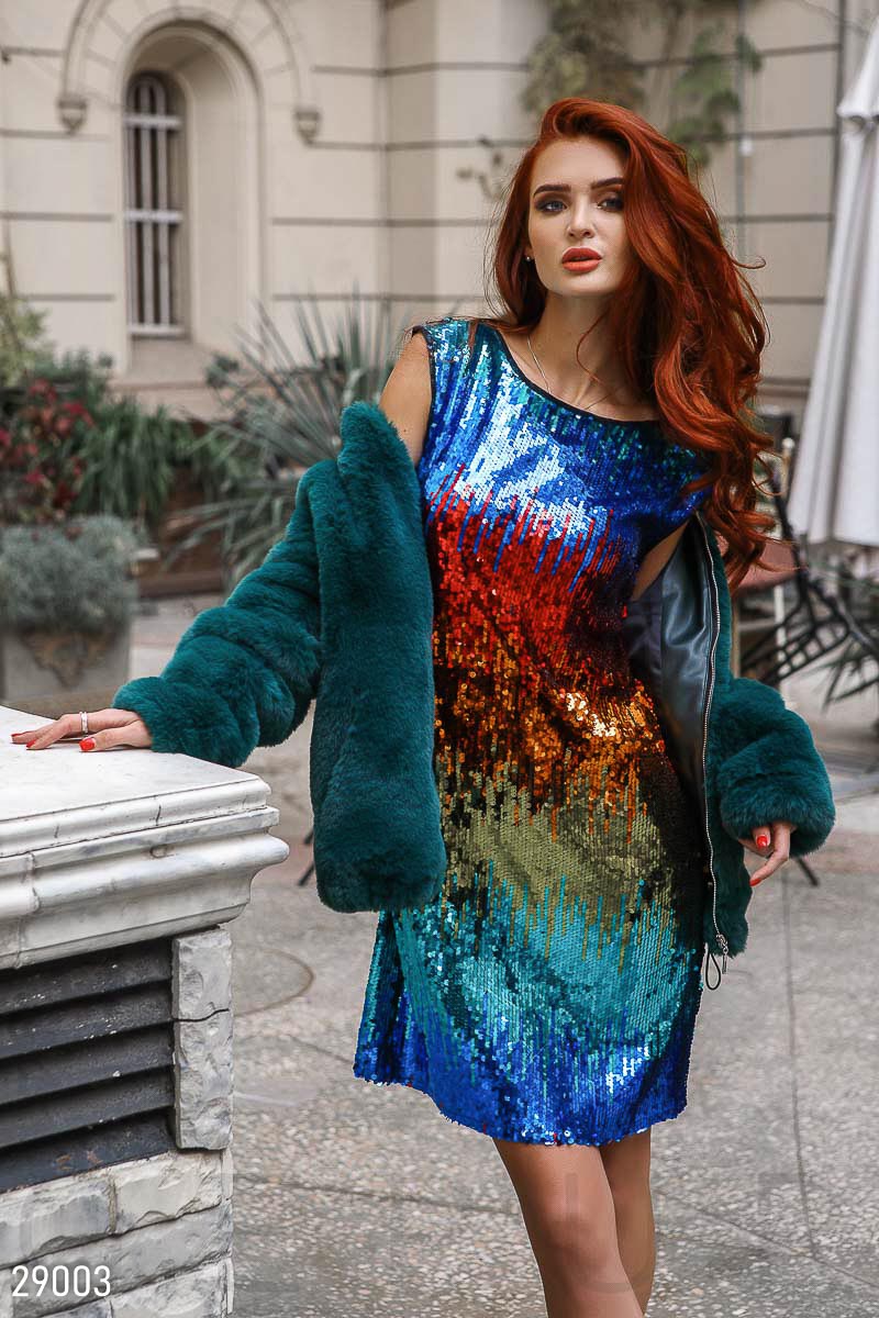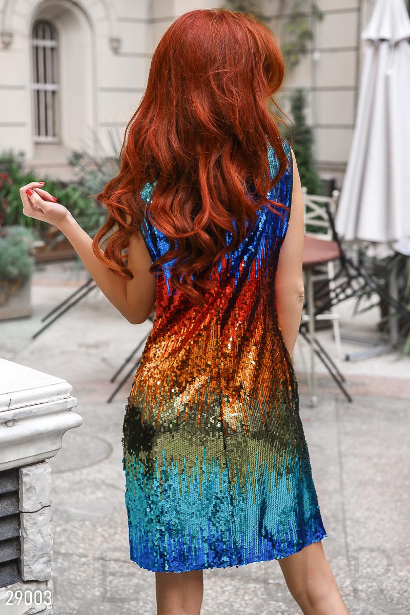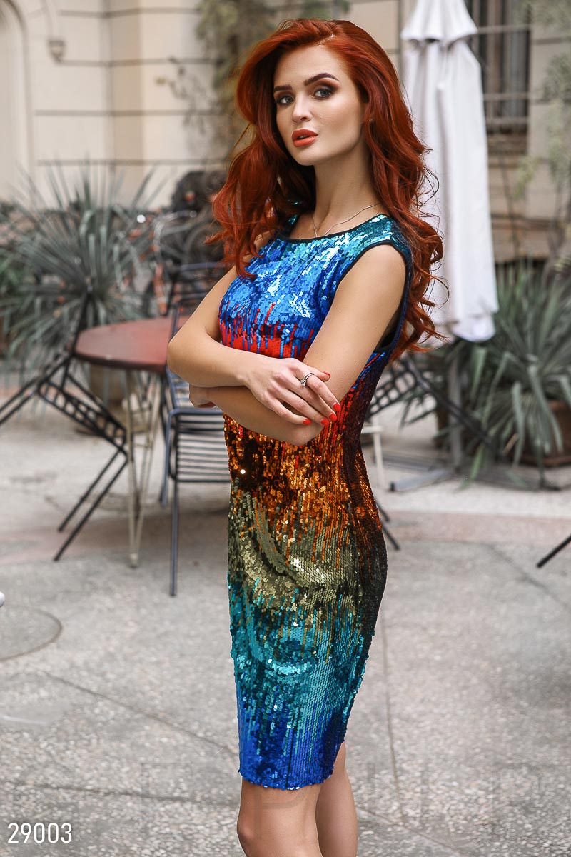 Приталенное вечернее платье, расшитое цветными пайетками.