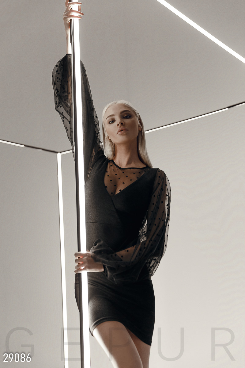 Облегающее платье-мини от дизайнеров Gepur, выполненное из эластичной ткани с мерцающим эффектом: прозрачная кокетка с флоковым напылением и пышные рукава на эластичной бархатной манжете. Коллекцию представила Алена Шишкова – 2-я Вице-мисс Россия 2012.