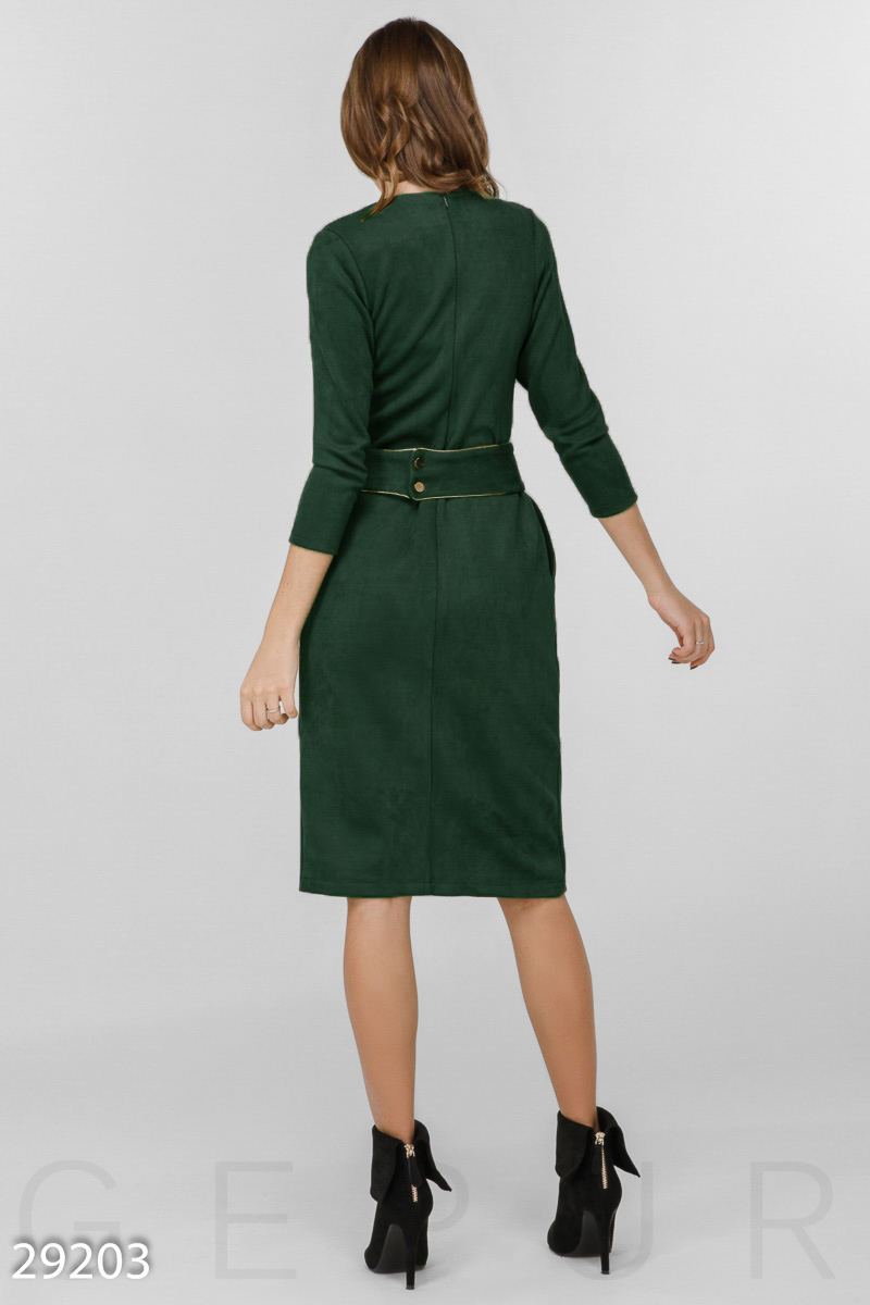 Стильное платье-футляр с контрастным кантом, выполненное из мягкой эко-замши на основе: аккуратный v-образный вырез спереди, облегающий рукав 3/4, юбка с ложным запáхом и двумя прорезными карманами по бокам, съемный пояс с застежкой на кнопки.