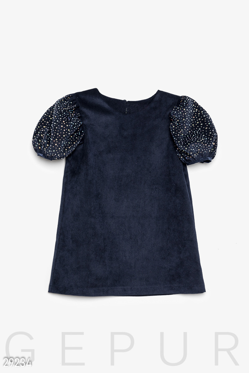 Вельветовое платье с классическим круглым вырезом и пышными рукавами-фонариками со сверкающим декором.