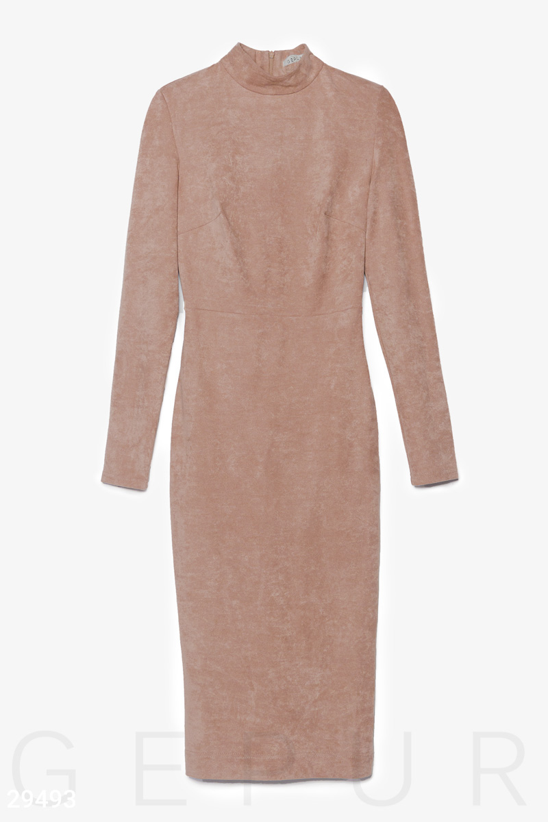 Облегающее деловое платье-миди от дизайнеров Gepur, выполненное из мягкой эко-замши: воротник-стойка, отрезная талия, разрез сзади и трендовый акцент на плечах.