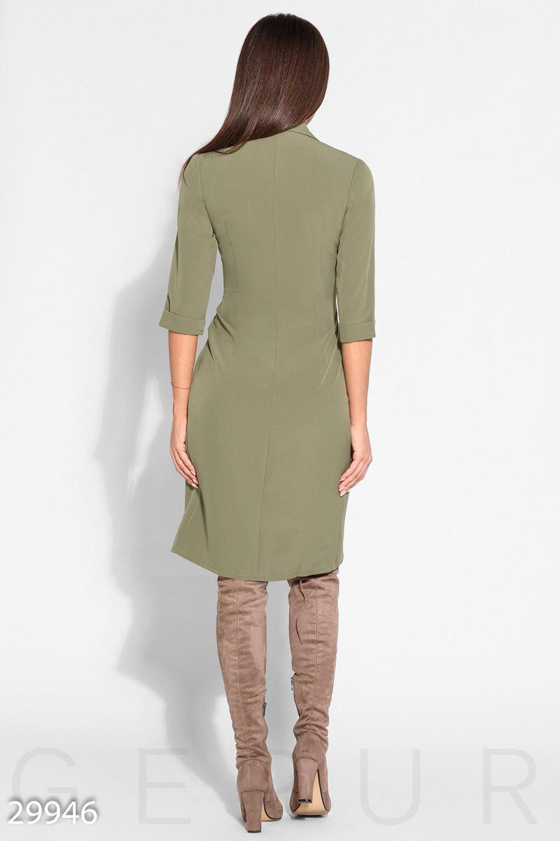 Стильное двубортное платье на запа́х с отложным воротником, лацканами, рукавом 3/4 и двумя прорезными карманами по бокам.