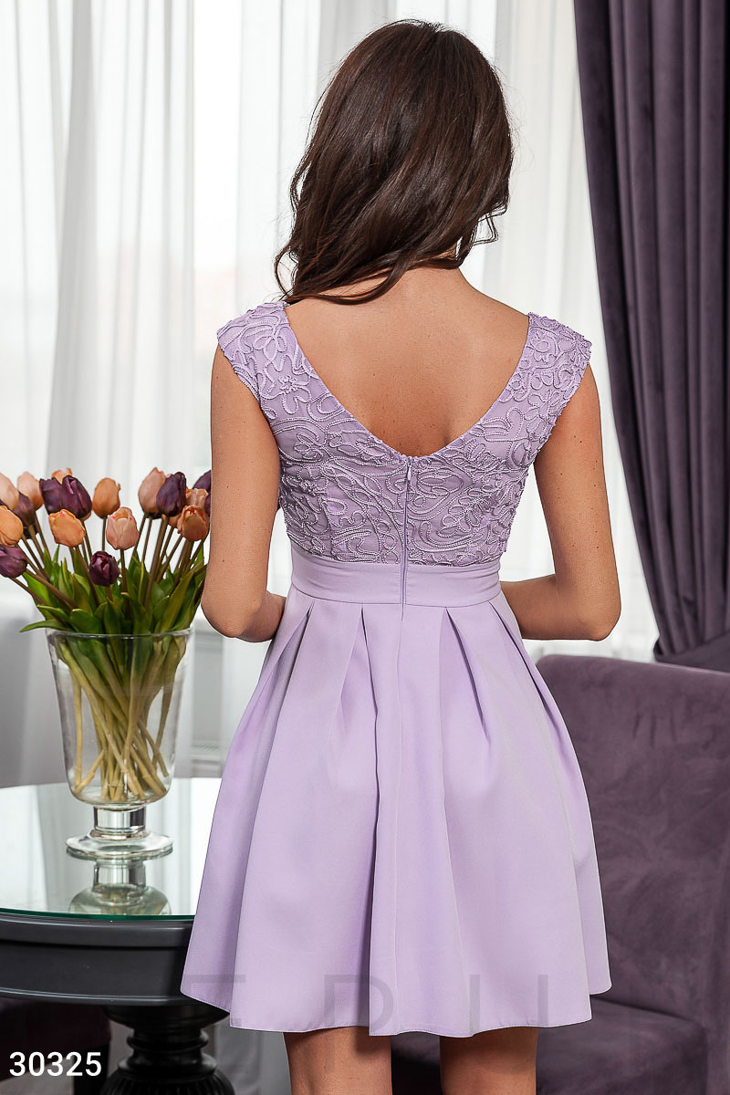 Актуальное вечернее платье-мини с вырезом-лодочка спереди и небольшим v-образным сзади, кокетка из сетки с фигурным декором, втачной пояс и расклешенная юбка со встречными складками.